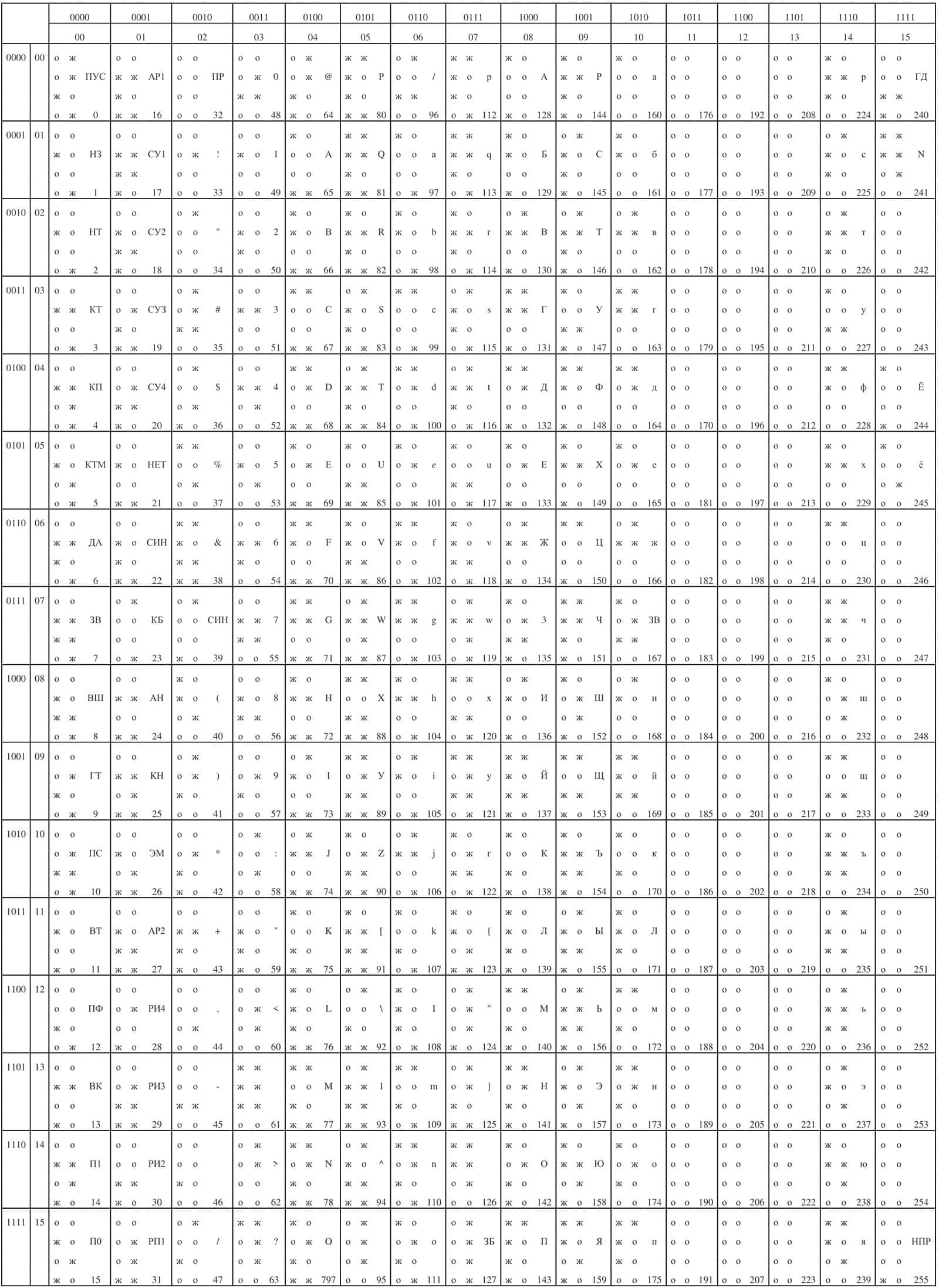 | 00 | У п р а в л я ю щ и е с и м в о л ы и з н а б о р а С0 | З н а к и и ц и ф р ы п о Г О С Т 2 7 4 6 3 | Л а т и н с к и й а л ф а в и т и с и м в о л ы | Р у с с к и е п р о п и с н ы е б у к в ы | Р у с с к и е с т р о ч н ы е б у к в ы | Р у с с к и е с т р о ч н ы е б у к в ы | ГД № | |||||||||