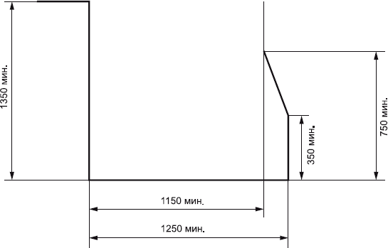 5.11 Нижний край опорной панели должен находиться на высоте не менее 350 мм и не более 480 мм, измеренной вертикально от пола зоны для инвалидных колясок. Верхний край опорной панели должен находиться на высоте не менее 1300 мм, измеренной вертикально от пола площадки для инвалидных колясок.