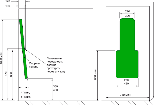 5.13 Опорную панель устанавливают под углом не менее 4° и не более 8° по отношению к вертикали, причем нижний край опорной панели должен располагаться ближе к задней части вагона, чем верхний край. Смягченная поверхность опорной панели должна проходить через любую точку воображаемой вертикальной плоскости, расположенной сзади от передней границы зоны для инвалидных колясок и на расстоянии не менее 100 мм и не более 120 мм от передней границы зоны для инвалидных колясок, измеренном по горизонтали, и на высоте не менее 830 мм и не более 870 мм от пола площадки для инвалидных колясок, как указано на рисунке 3 приложения А.