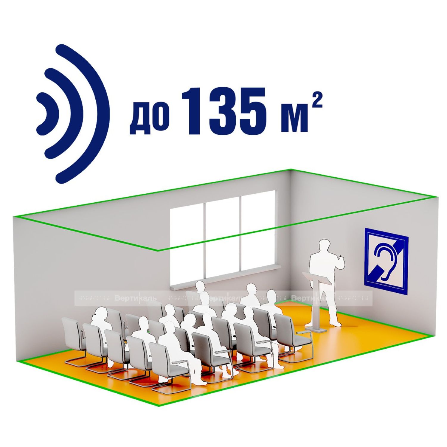Стационарная индукционная система VERT-135 предназначена для применения в больших помещениях до 135 м², усиливая восприятие информации людьми с нарушениями по слуху (использующих слуховые аппараты) в ограниченном пространстве и при большом скоплении людей, а также наличии посторонних звуков или преграды между собеседниками.