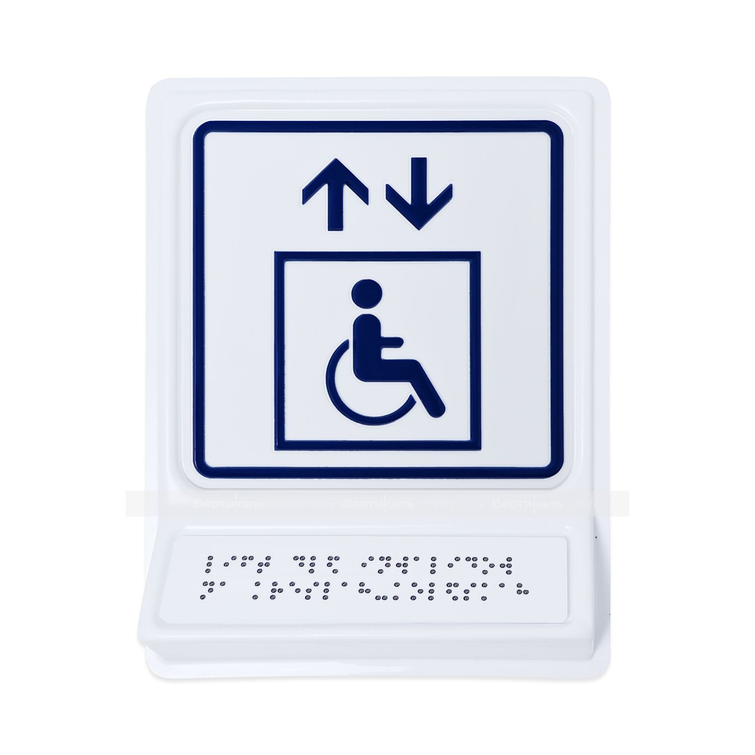 Пиктограмма с дублированием информации по системе Брайля на наклонной площадке «Лифт для инвалидов на креслах-колясках», синяя, 240х180х30 мм