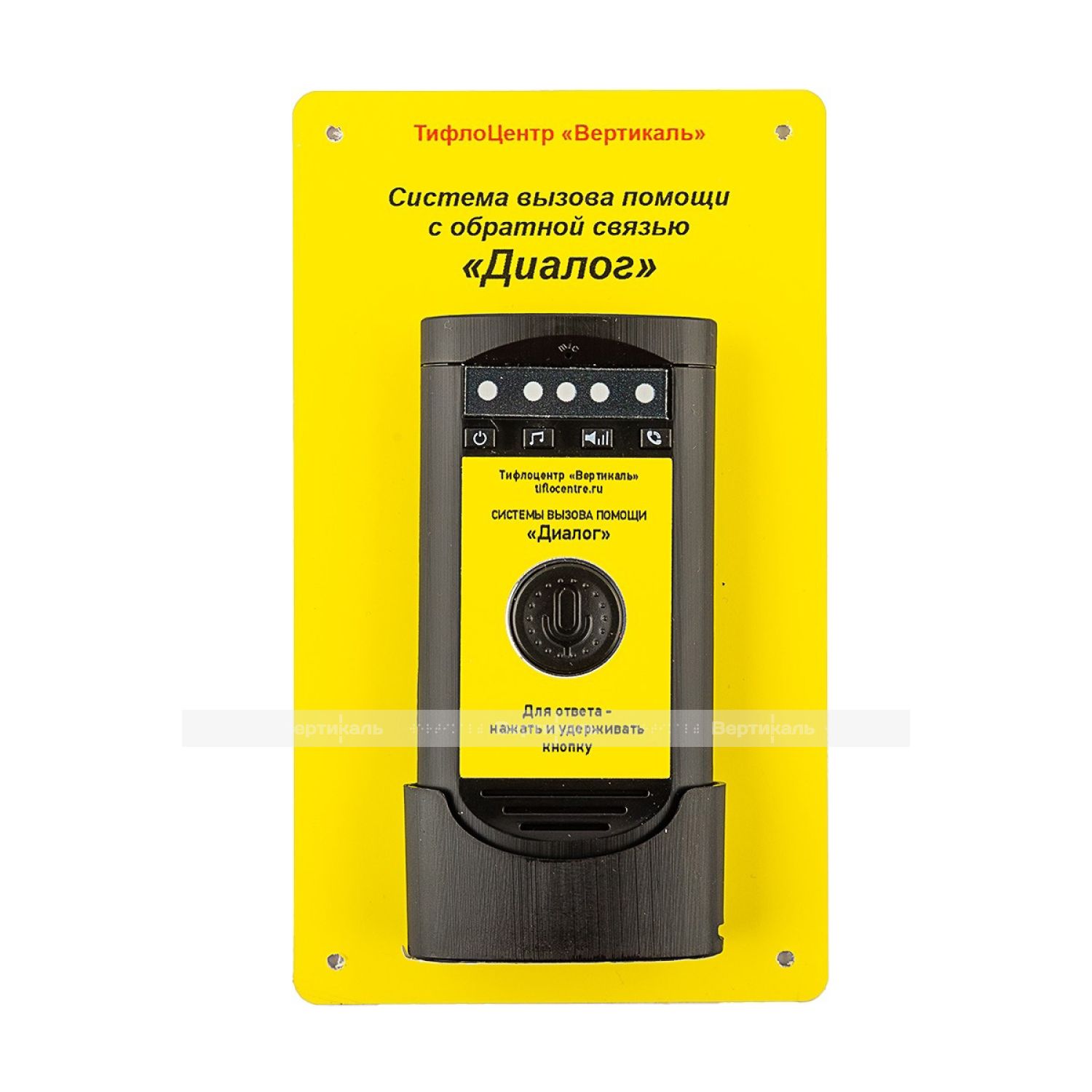 Система связи "Диалог" выполнена из высокопрочного ABS пластика, передатчик оснащён, тактильной табличкой и стальным козырьком, защищающем устройство от осадков, что позволяет устанавливать его в зоне входной группы. Приёмник оснащен аккумулятором и зарядной станцией, в комплекте идет USB провод для зарядки, а так же информационной табличкой с краткой инструкцией по применению.