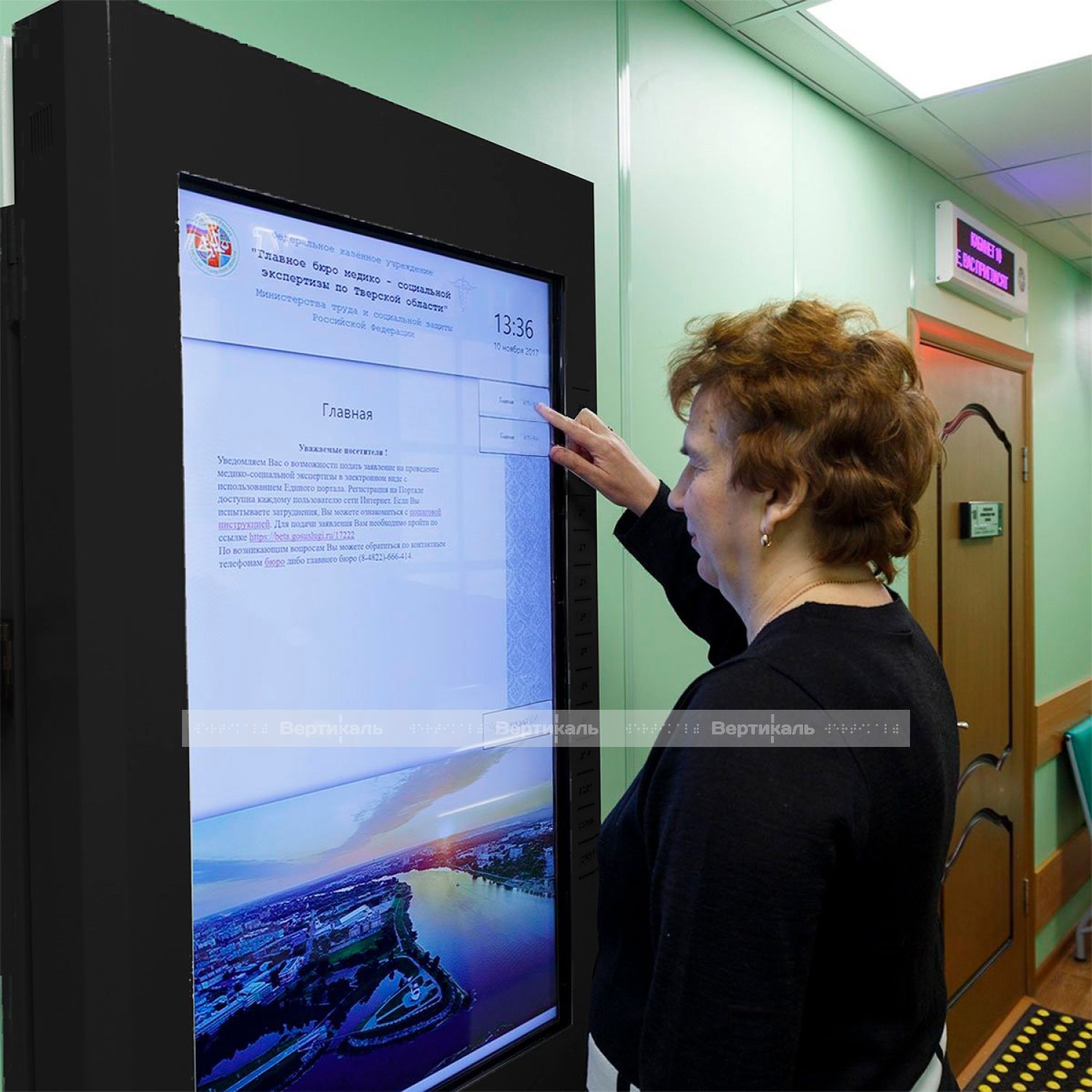Сенсорный информационный терминал специально разработан для использования его в качестве информационного устройства лицам с ограничениями по здоровью (слабовидящих, в коляске).
