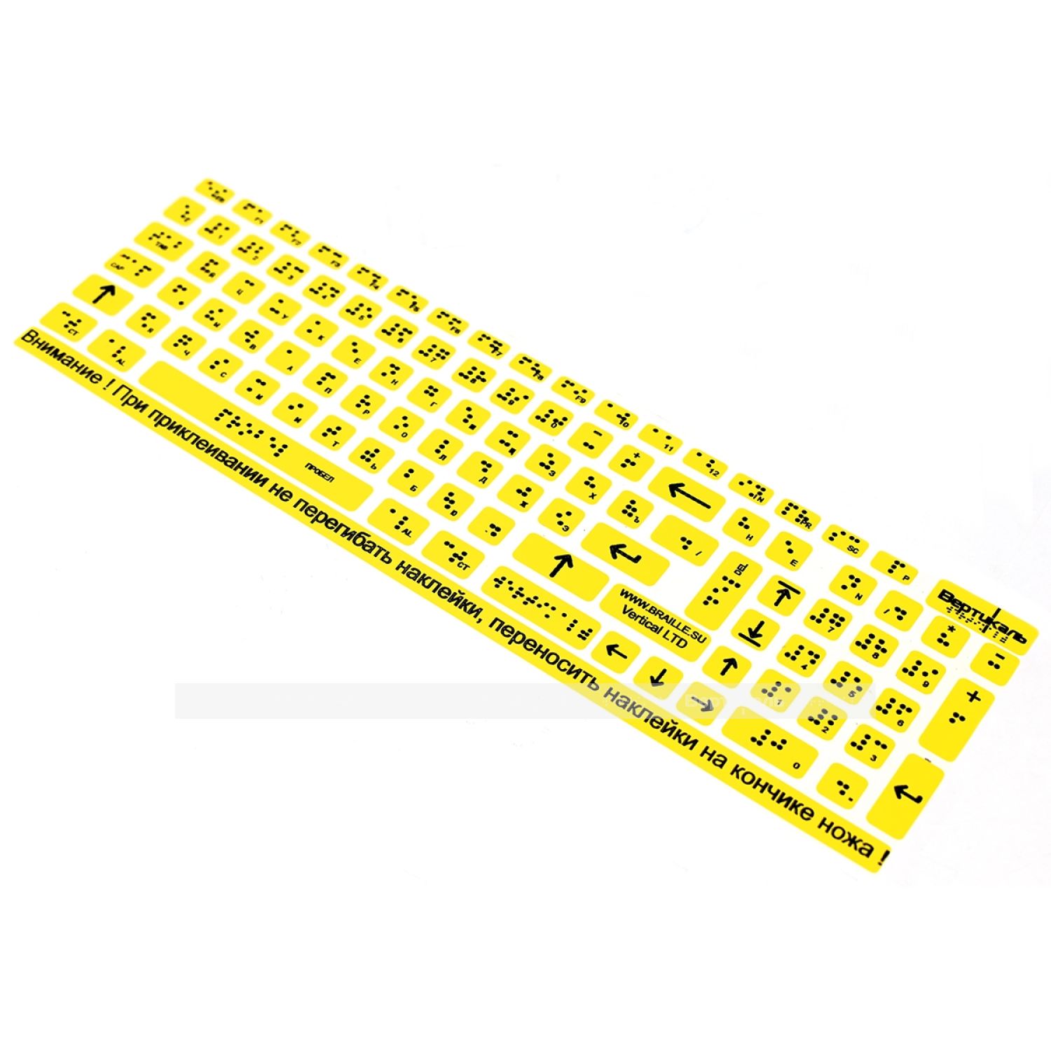 Набор наклеек для клавиатуры с рельефно-точечным шрифтом по системе Брайля предназначены для маркировки клавиш. Наклейки помогают считывать информацию на клавиатуре людям с нарушением зрения. Наклейки изготовлены из ПВХ жёлтого цвета.