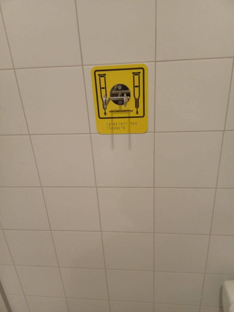 Недавно оборудовали санузел в нашей организации, в том числе и крючок для костылей. Посетители говорят, что очень удобно.Спасибо!