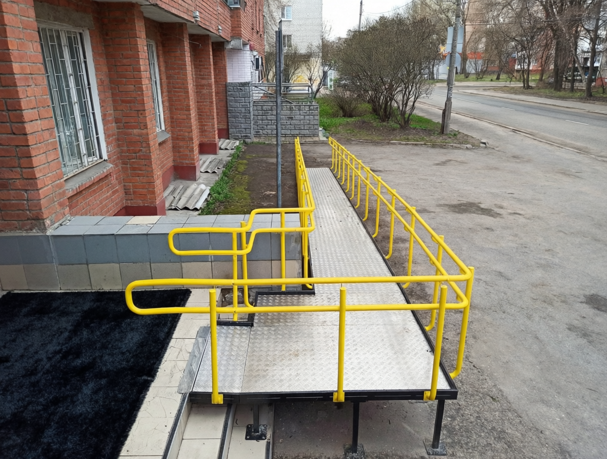 Сделали модульный пандус под наш нестандартный вход. Очень довольны, что выбрали сборно-разборную модель: при необходимости можно перенести или демонтировать. Металл толстый, прочный, покрытие отличное. Теперь и маломобильные пациенты, и мамы с колясками заезжают без проблем.