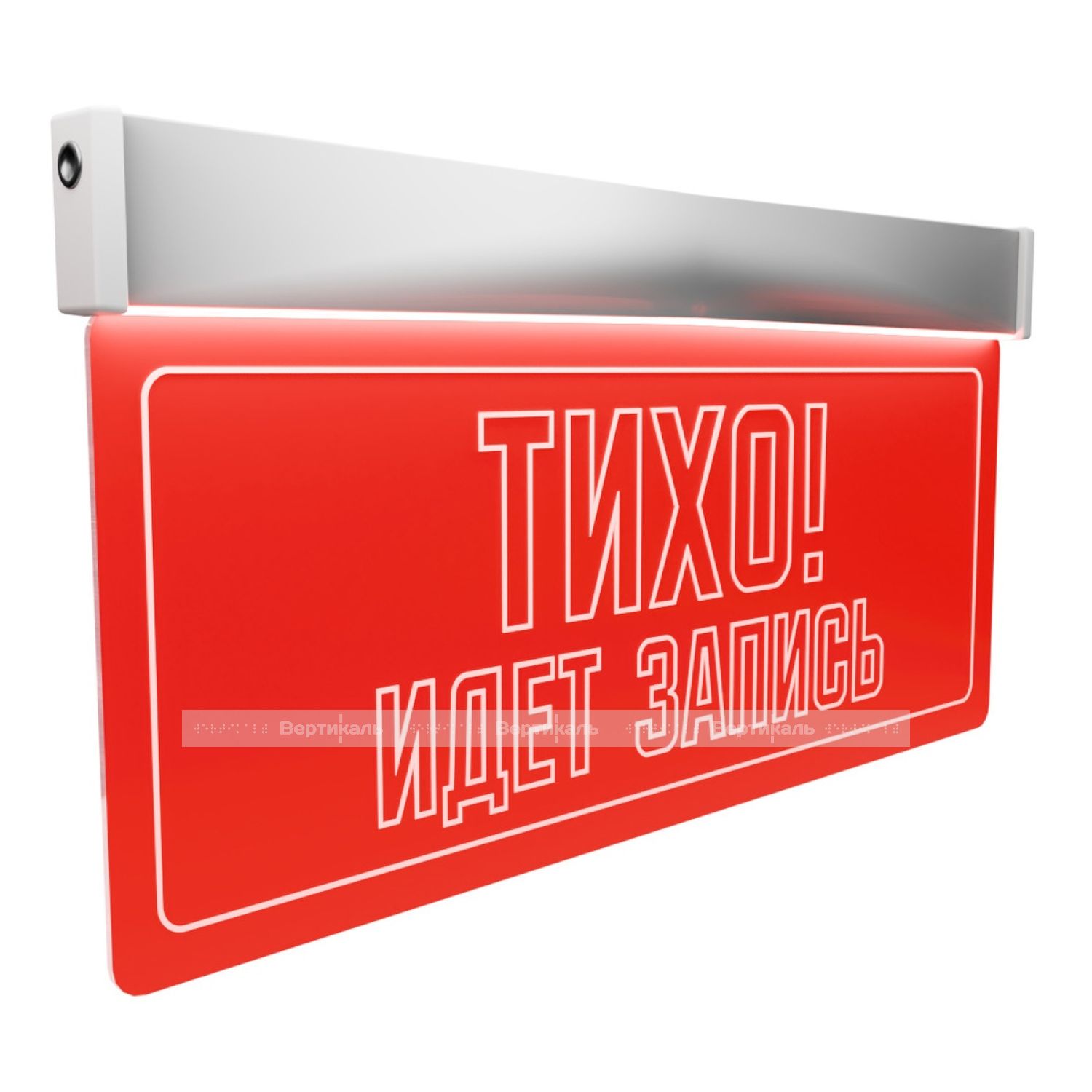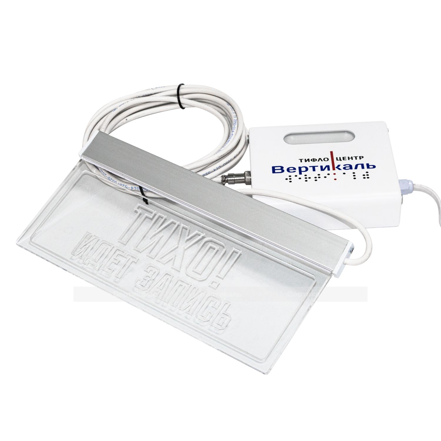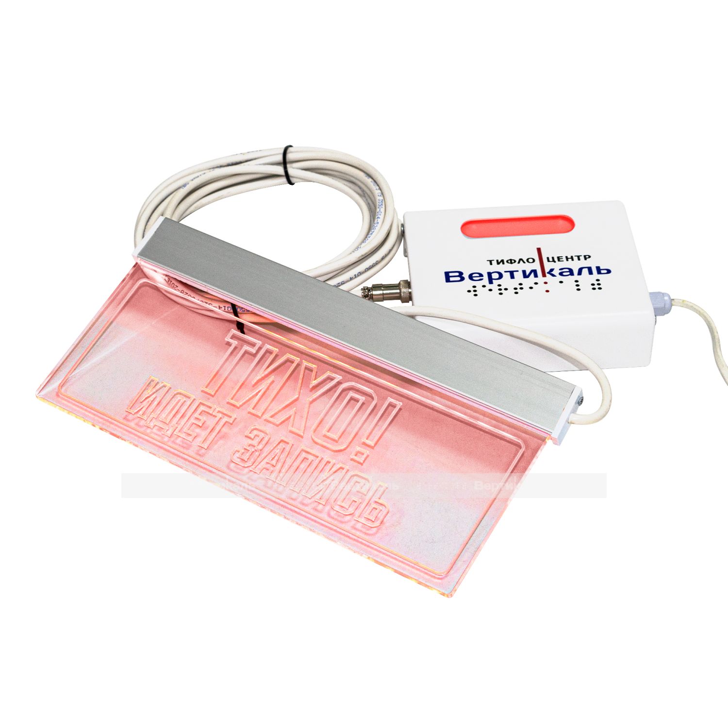 Изделие представляет собой систему оповещения, состоящую из блока активации и визуально-информационного табло с надписью «ТИХО! ИДЕТ ЗАПИСЬ». Табло устанавливается перед входом в кабинет, блок активации — внутри. Устройства соединяются кабелем ПВС 3х0,5 длиной 5 м (в комплекте) и питаются от сети 220 В. Подсветка табло включается красным светом по сигналу с пульта (кнопка «А») и отключается кнопкой «В». Цвет подсветки дублируется в окошке блока активации для удобства контроля. Красное свечение означает запрет входа, отсутствие — разрешение. Блок оснащён выключателем питания для обоих устройств.