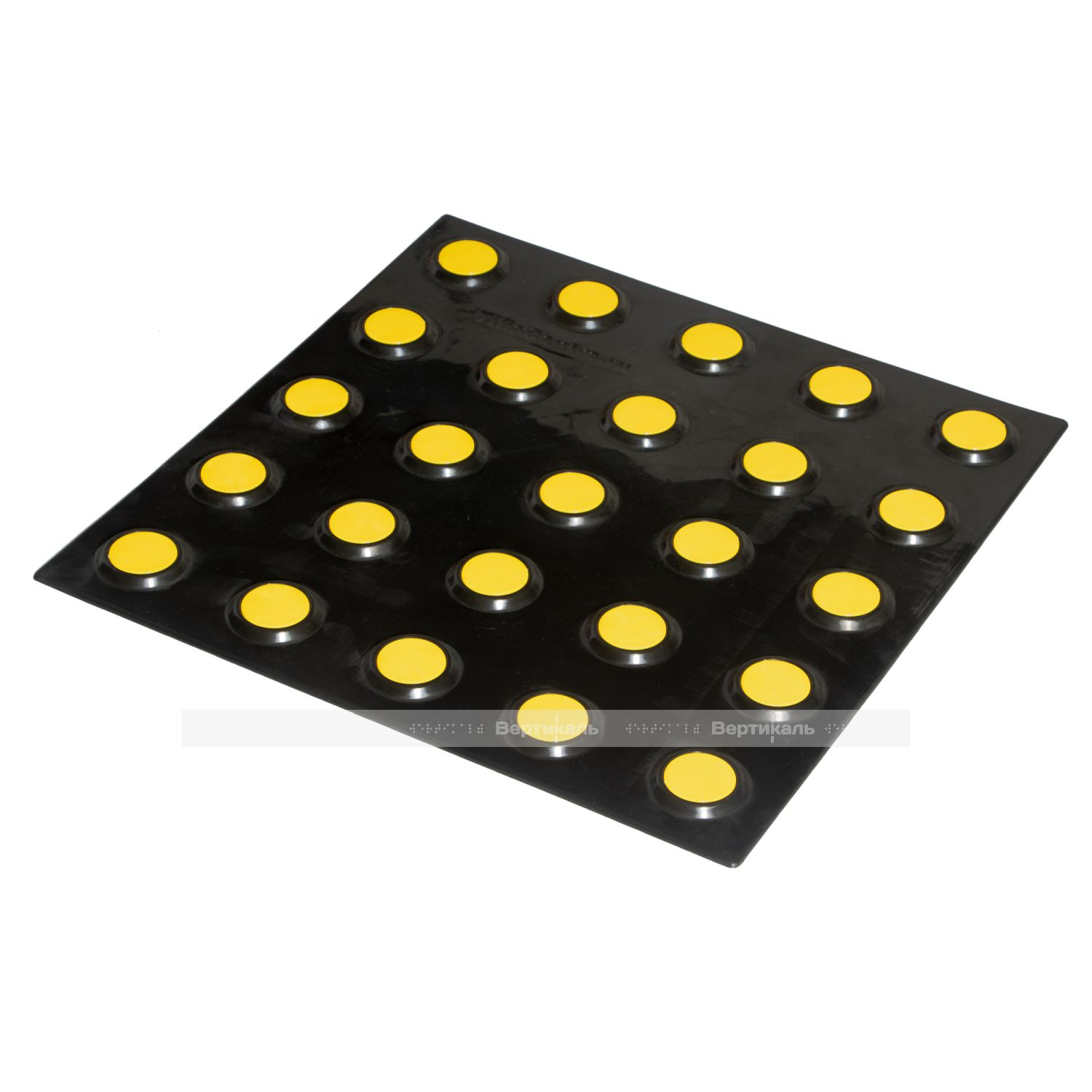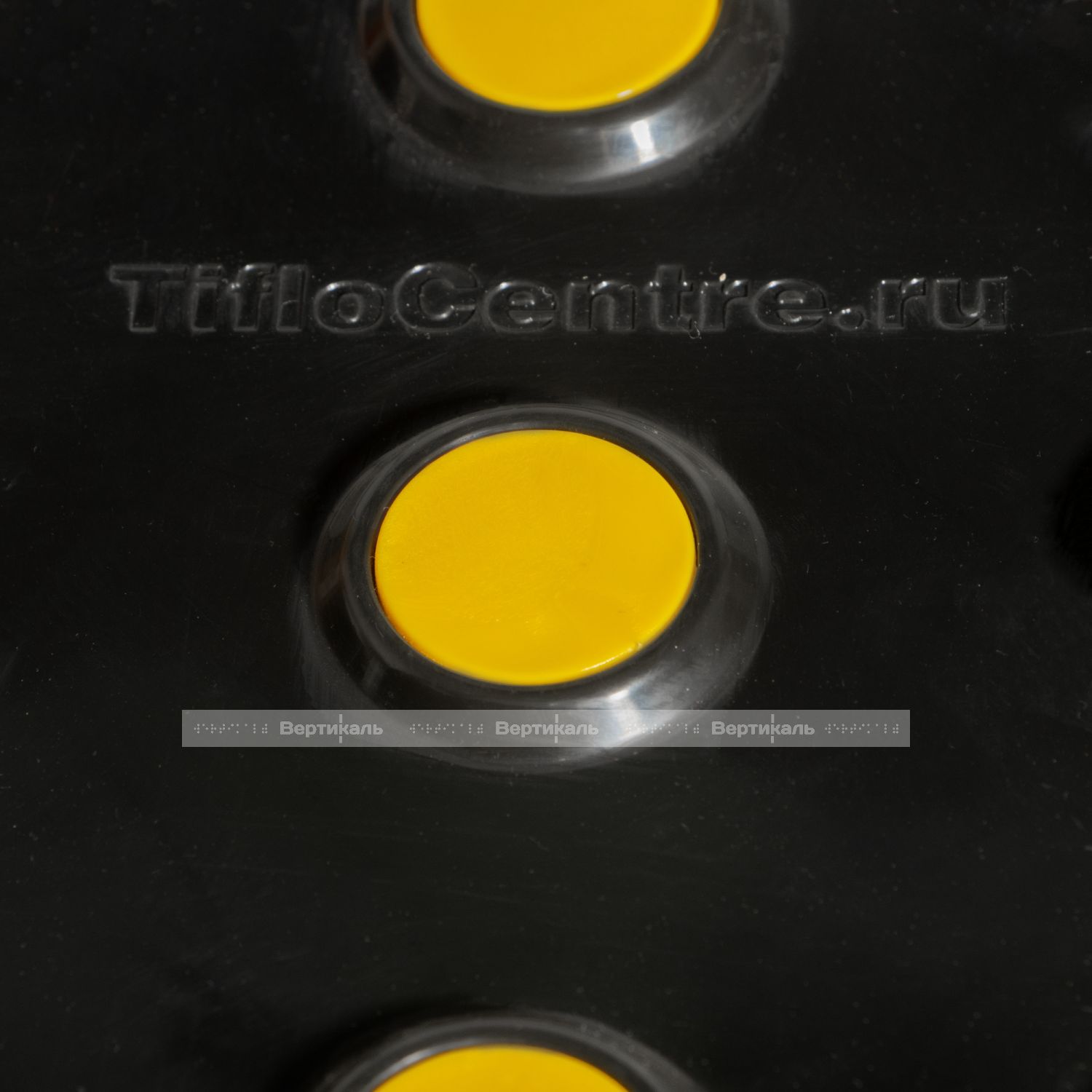 Тифлоцентр «Вертикаль» разработал и вывел на производственный уровень инновационную тактильную продукцию, полностью отвечающую нормативным требованиям ГОСТ Р 52875-2018 «Указатели тактильные наземные для инвалидов по зрению». Данный вид самоклеящегося ТНУ имеет полиуретановое основание в черном варианте со гладкими сменными вставками желтого цвета из полистирола и предназначен для укладки внутри и снаружи помещений с большим потоком посетителей.
