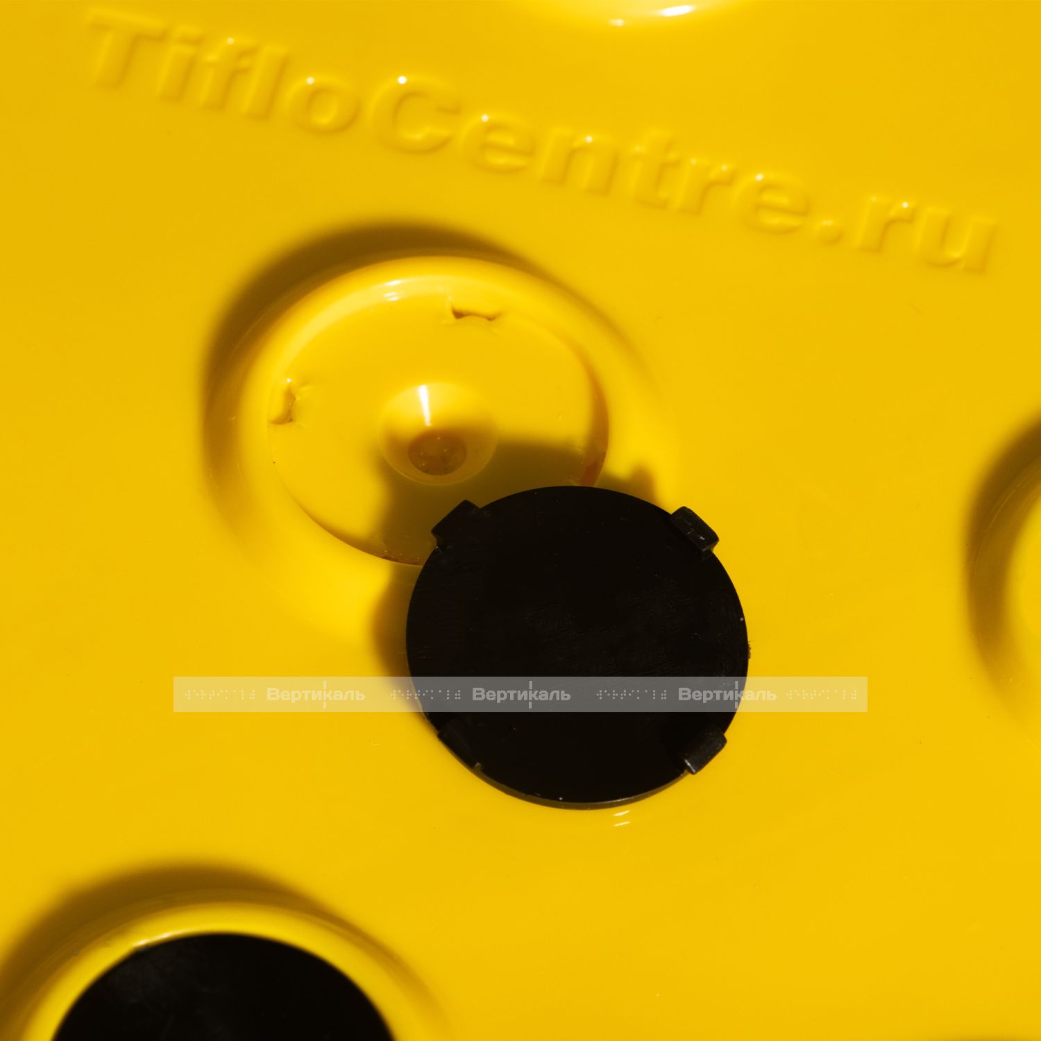 Тифлоцентр «Вертикаль» разработал и вывел на производственный уровень инновационную тактильную продукцию, полностью отвечающую нормативным требованиям ГОСТ Р 52875-2018 «Указатели тактильные наземные для инвалидов по зрению». Данный вид самоклеящегося ТНУ имеет полиуретановое основание в желтом варианте со гладкими сменными вставками черного цвета из полистирола и предназначен для укладки внутри и снаружи помещений с большим потоком посетителей.
