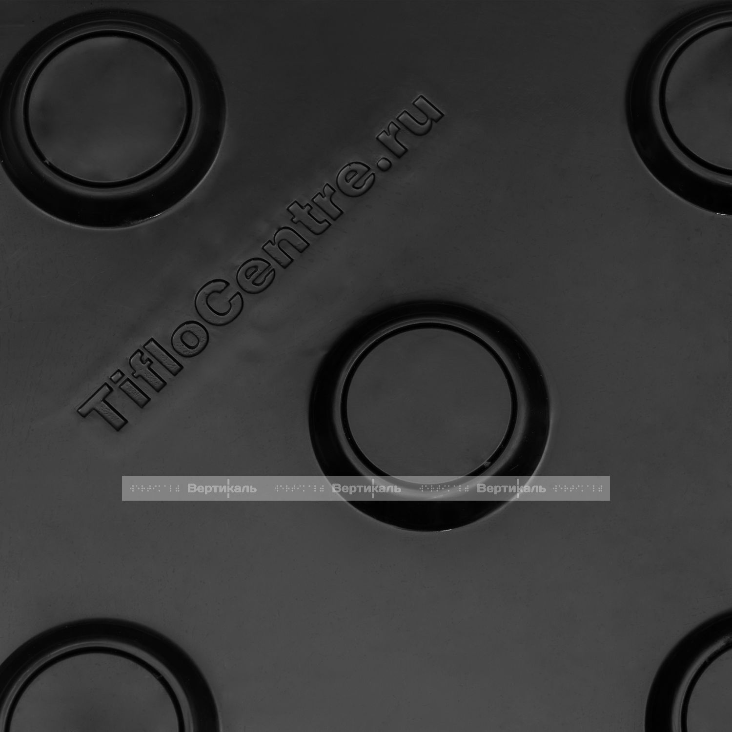 Данные указатели выполнены в единой цветовой гамме: основание и вставки имеют одинаковый (чёрный) цвет. Такое решение может применяться по техническим условиям проекта или при необходимости минимального визуального акцента. Высота подъёма тактильных элементов 4 мм.