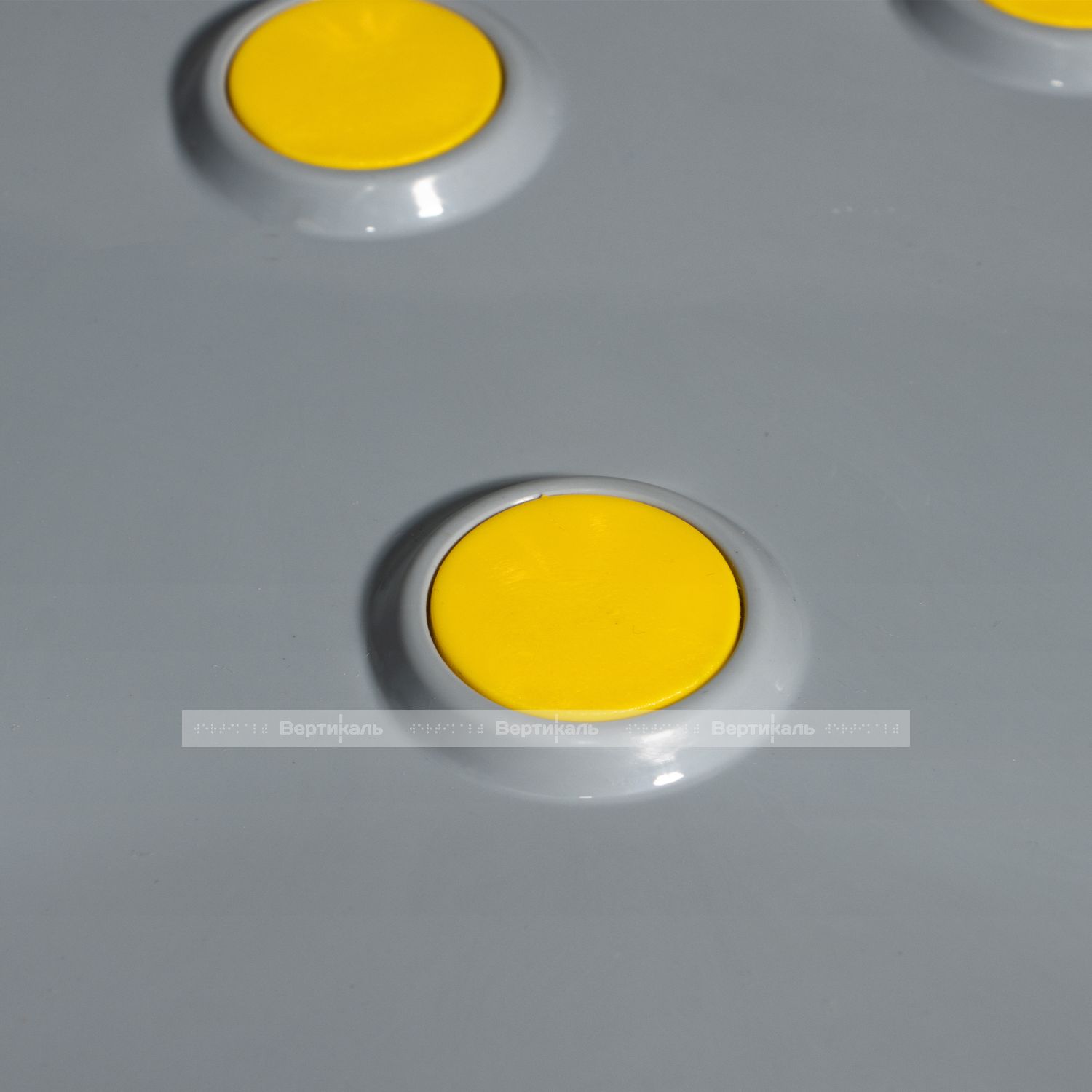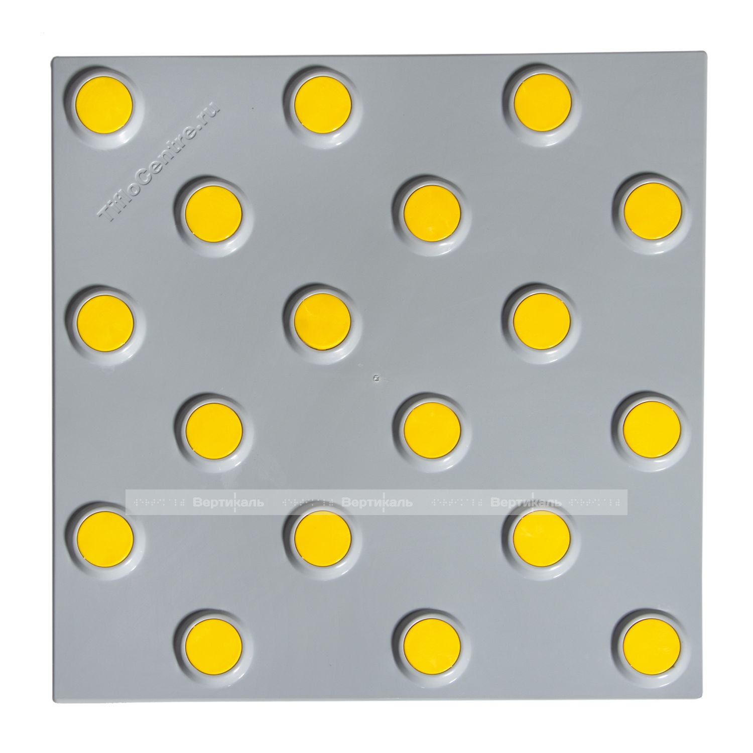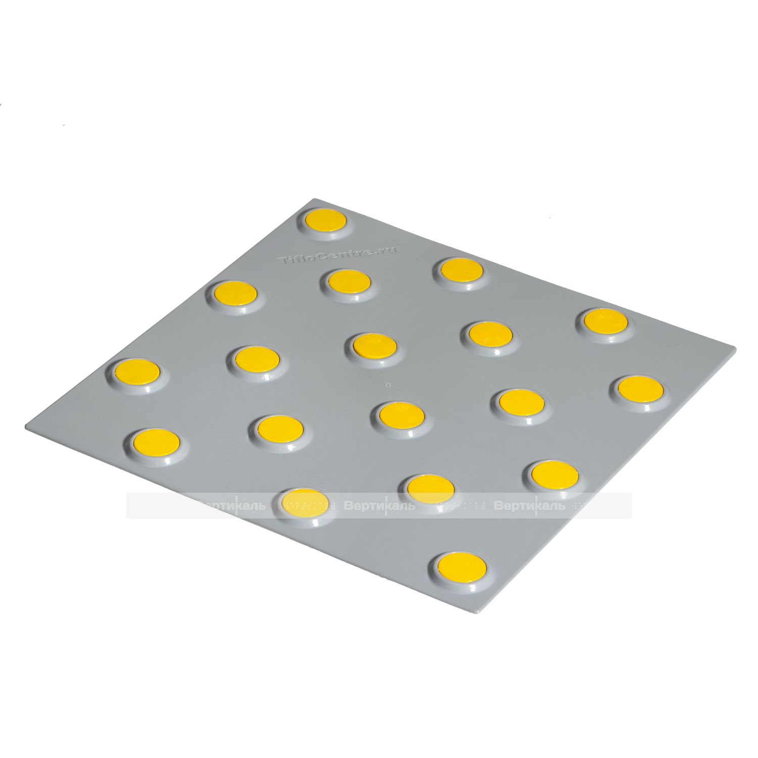 Плитка тактильная контрастная, со сменными гладкими вставками (непреодолимое препятствие, конусы шахматные), 300х300х6, PU/PL, серый/желтый