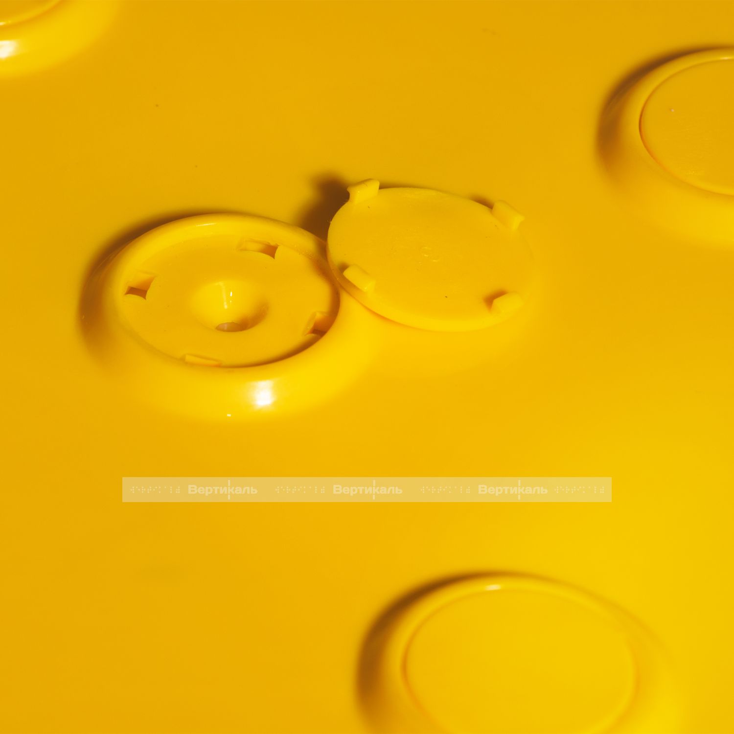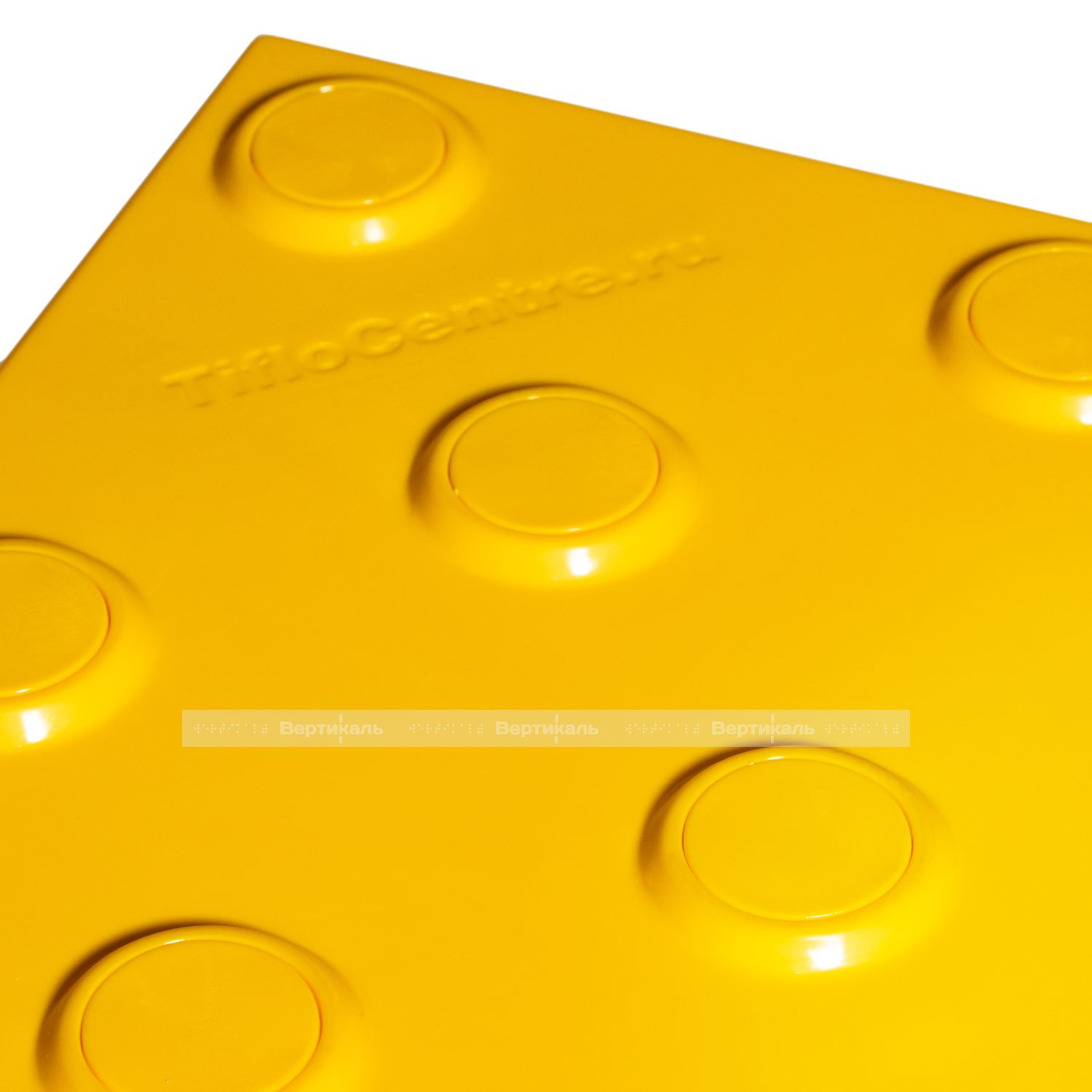 Тифлоцентр «Вертикаль» разработал и вывел на производственный уровень инновационную тактильную продукцию, полностью отвечающую нормативным требованиям ГОСТ Р 52875-2018 «Указатели тактильные наземные для инвалидов по зрению». Тактильный наземный указатель желтого цвета имеет полиуретановое основание с желтыми гладкими сменными вставками из полистирола и предназначен для укладки внутри и снаружи помещений с большим потоком посетителей.