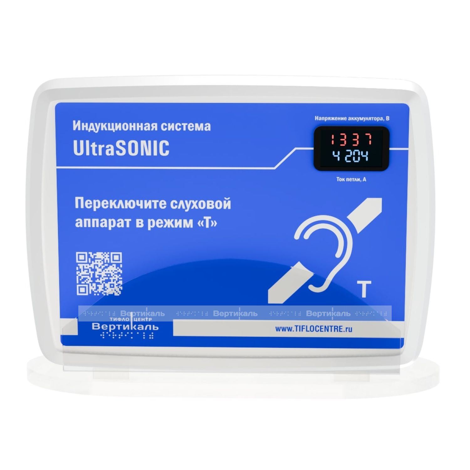 Портативная индукционная система "UltraSonic" разработана для передачи четкого звукового сигнала людям с нарушениями слуха в условиях высокого уровня окружающего шума или наличия барьеров между участниками коммуникации. Устройство предназначено для размещения в зонах массового обслуживания — кассовых стойках, окнах приема посетителей, административных пунктах и информационных центрах. Отличительной характеристикой системы является встроенный электромагнитный анализатор низкочастотного спектра, который визуализирует показатели работы индукционной петли на светодиодном экране. Аппарат транслирует качественный усиленный аудиосигнал напрямую в слуховой прибор (позиция "Т") вне зависимости от интенсивности фоновых звуков и присутствия физических барьеров между клиентом и сотрудником.