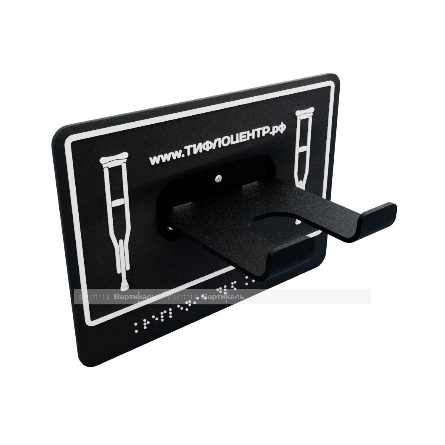 Универсальный травмобезопасный крючок-держатель рассчитан на одновременное крепление двух костылей или трости. Для слабовидящих он выделяется яркой пиктограммой в интерьере, а для полностью незрячих дополнен рельефными надписями по системе Брайля.