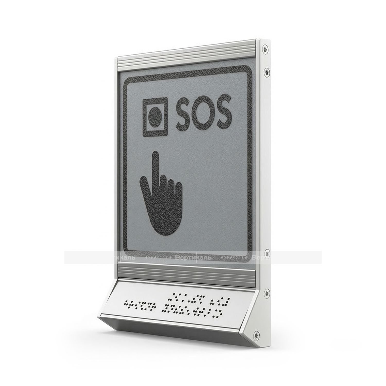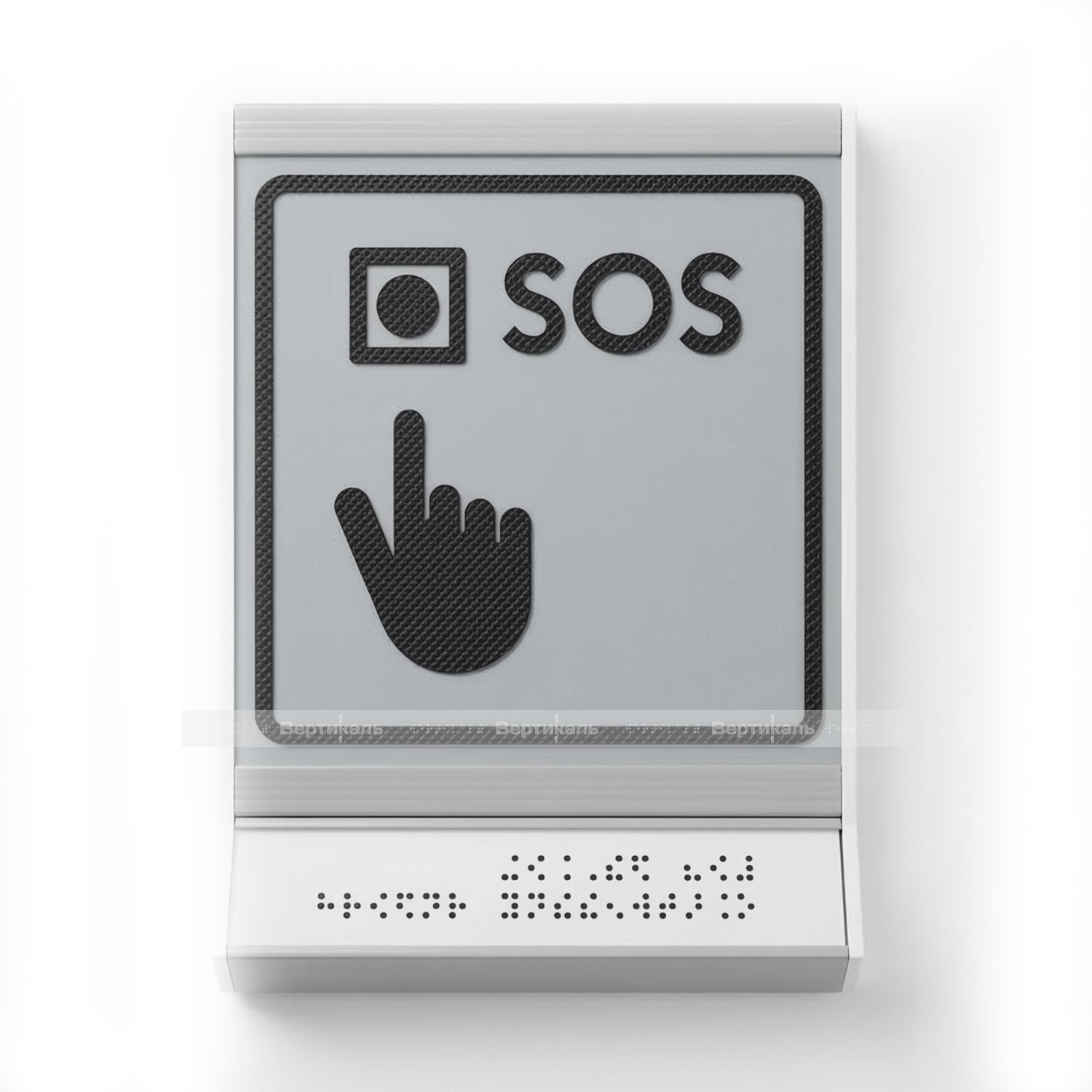 Модульная пиктограмма доступности с символическим изображением представляет собой информационный указатель, который передаёт информацию о кнопке вызова экстренной помощи. Указатель адаптирован к восприятию слабовидящими и тотально незрячими людьми.