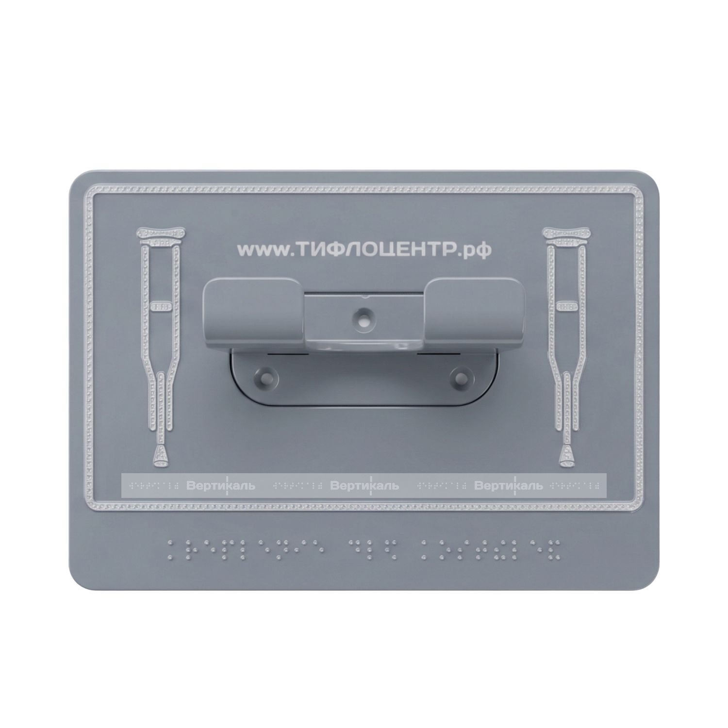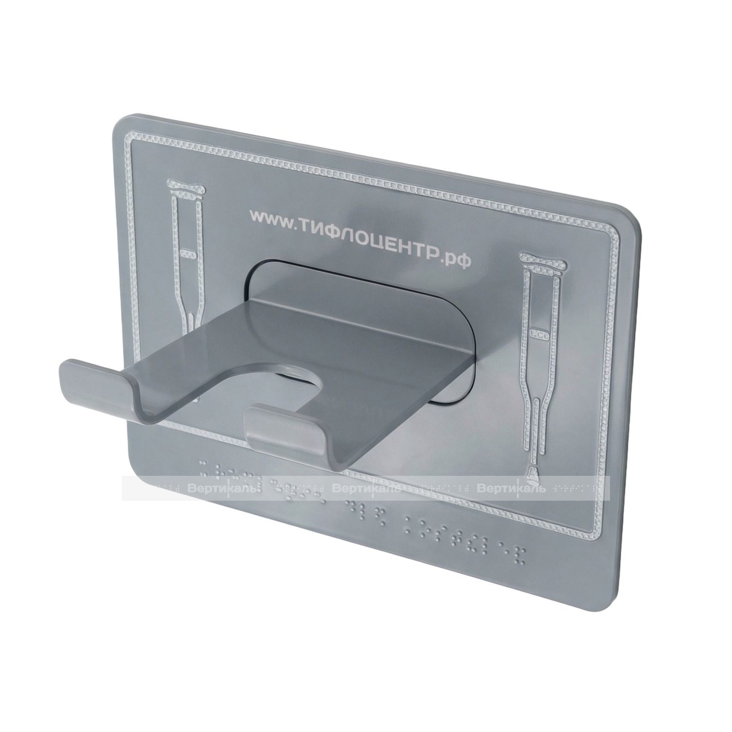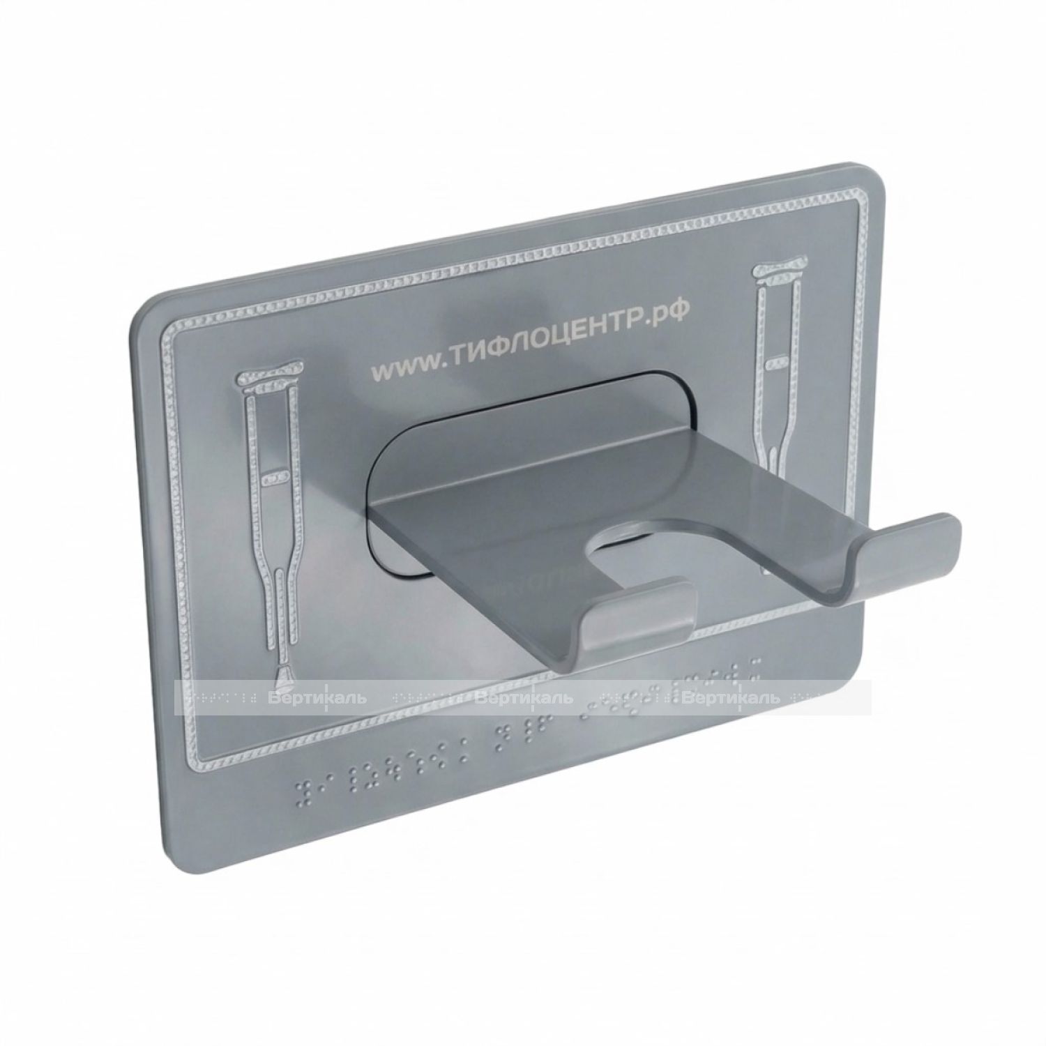 Универсальный травмобезопасный крючок-держатель предназначен для крепления одновременно 2-х костылей или трости. Для слабовидящих — держатель трости контрастно выделяется в интерьере яркой пиктограммой, а для тотально незрячих дополнительно нанесены рельефные надписи с применением системы Брайля. Согласно требований ФЗ "Технический регламент о безопасности зданий и сооружений" и СП 59.13330.2020 крючки для инвалидов, маломобильных групп населения (МГН) должны обязательно быть во всех санитарных узлах, гардеробных, спортивных раздевалках.