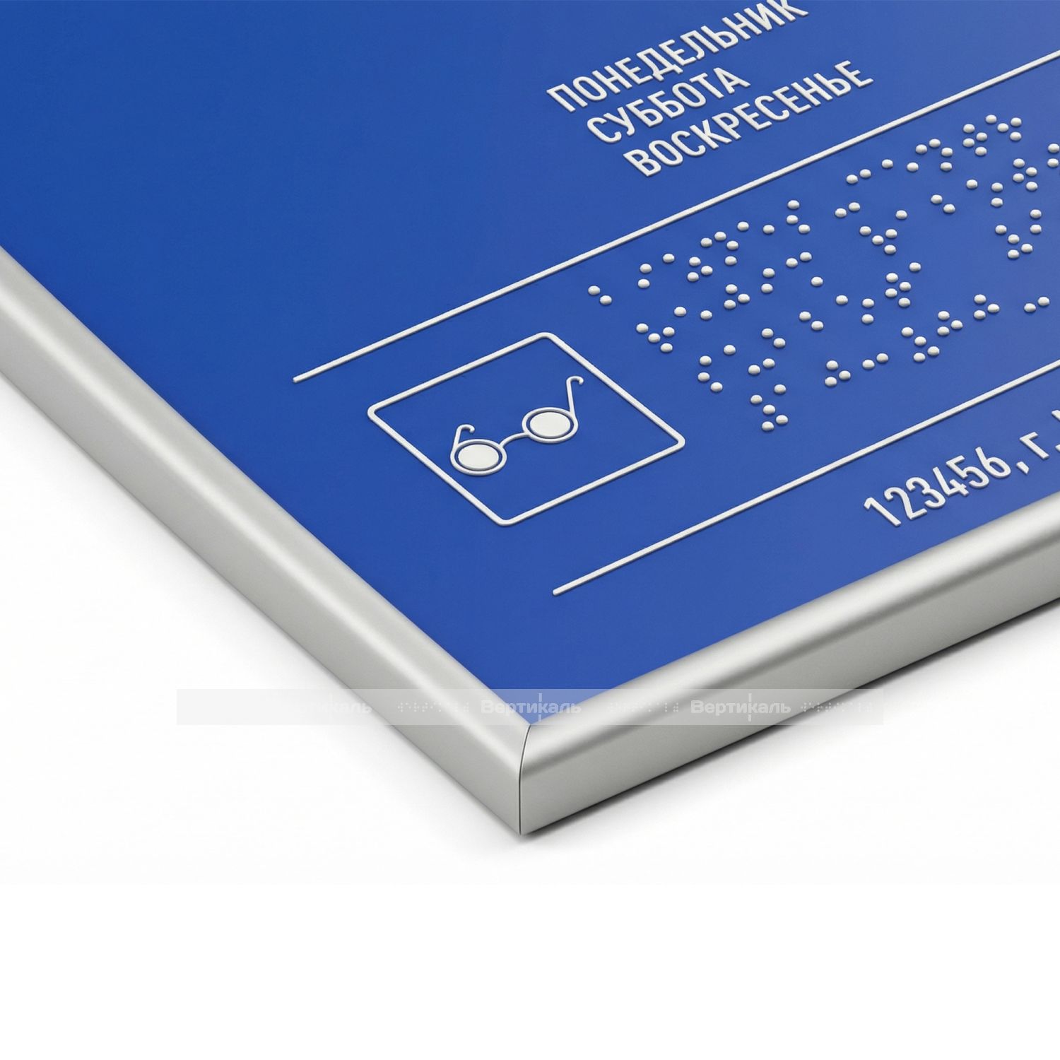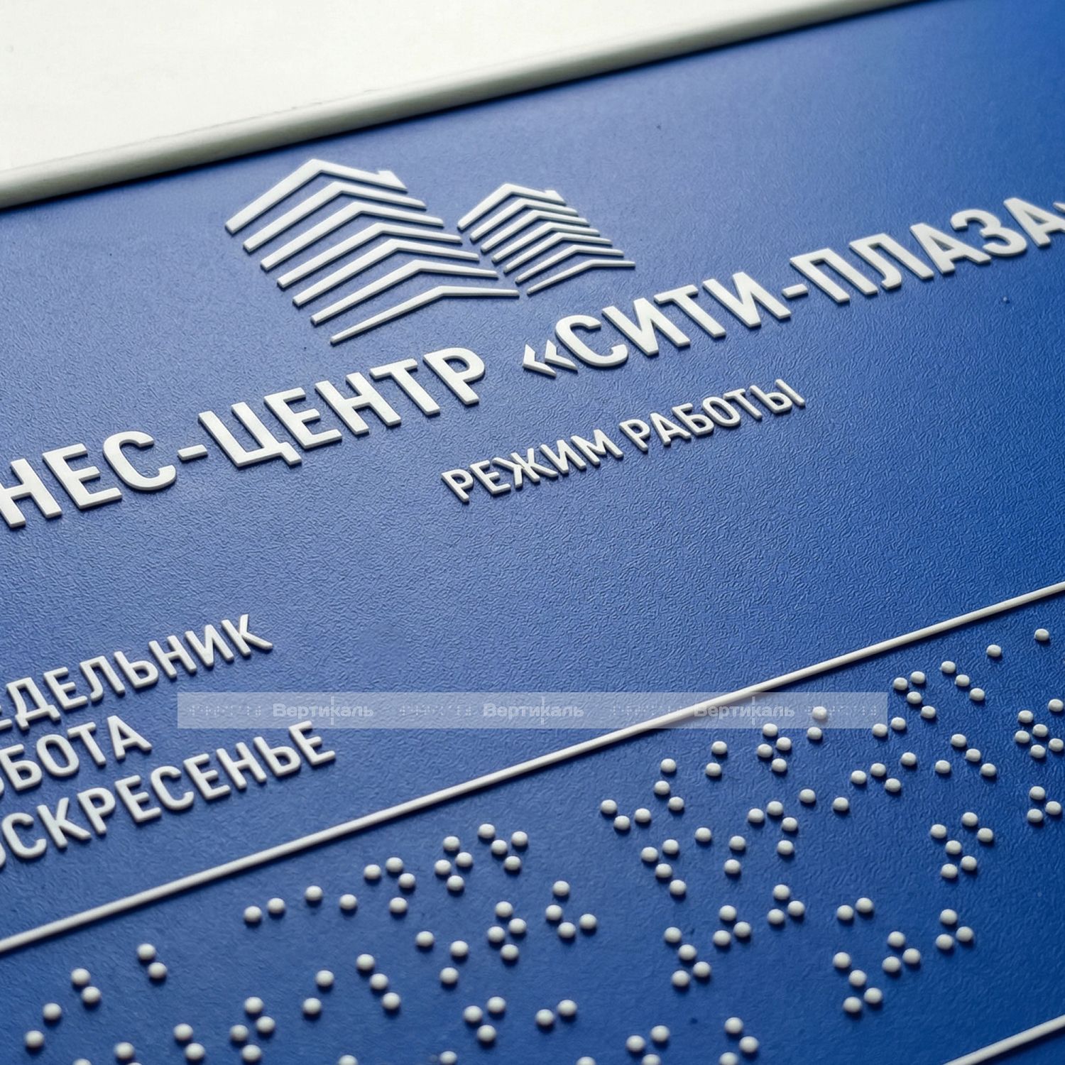 Изделие — тактильный указатель с тифлографикой, где информация об объекте или услугах адаптирована для тотально незрячих и слабовидящих. Содержание дублируется системой Брайля и выполняется в корпоративном стиле заказчика на основе композитных алюминиевых панелей.