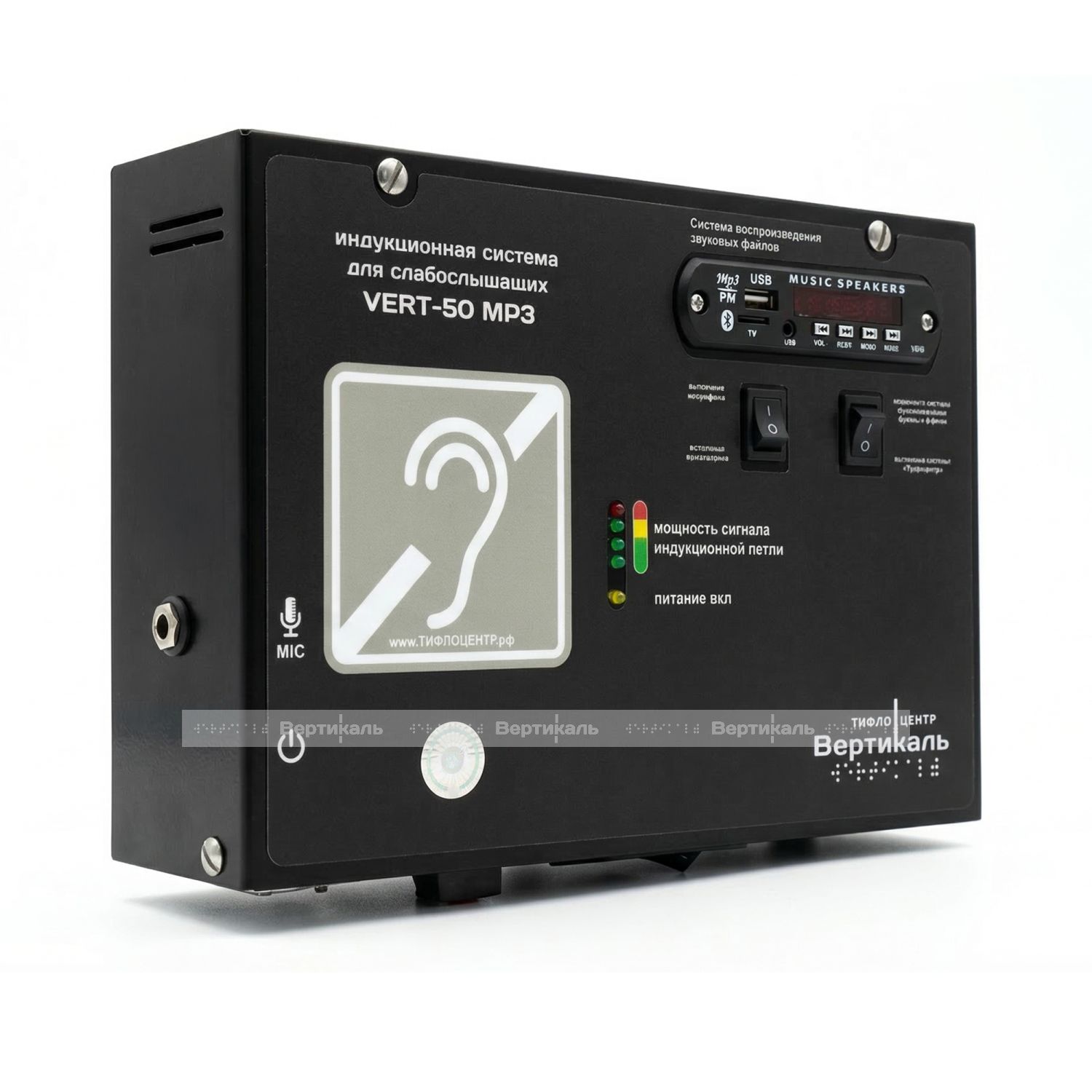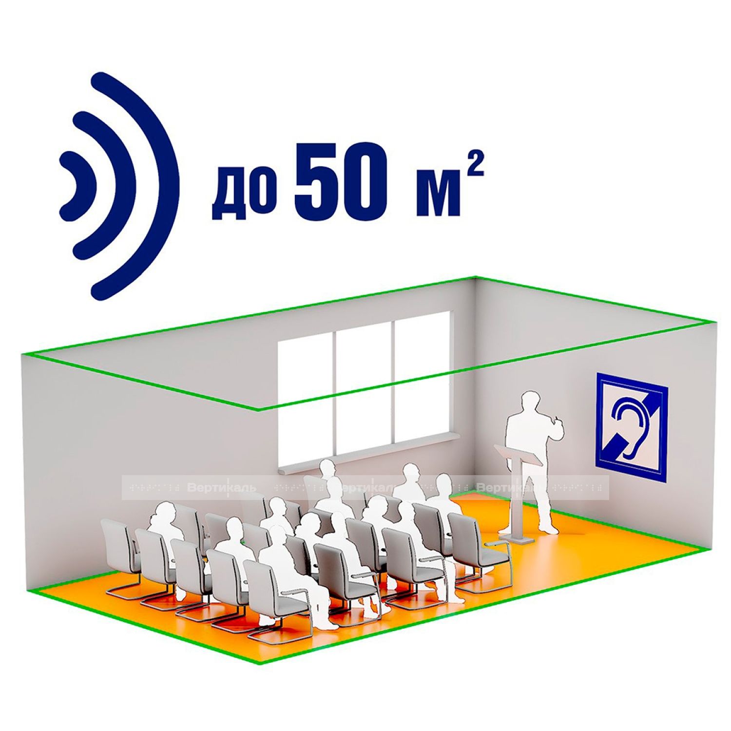 Стационарная индукционная система VERT-50 предназначена для использования в помещениях площадью до 50 м², усиливая восприятие речи людьми с нарушениями слуха (при работе слуховых аппаратов в режиме «T») в условиях повышенного шума или при наличии барьеров между собеседниками.