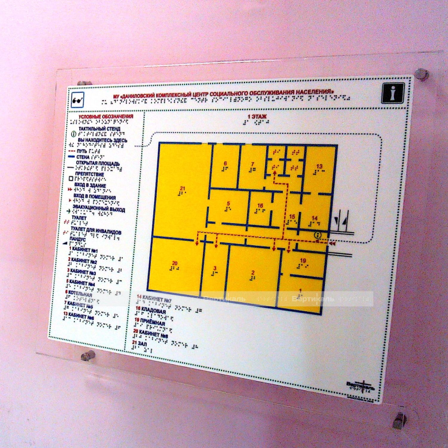 Изделие представляет собой устройство для настенного крепления тактильной мнемосхемы 630х800 мм, с целью её размещения в доступной зоне для людей с нарушением зрения. Для обеспечения продолжительного эксплуатационного периода и травмобезопасных условий, крепление изготовлено из цельнолитого прозрачного полимерного стекла, толщиной 10 мм, не имеющего клеевых соединений.