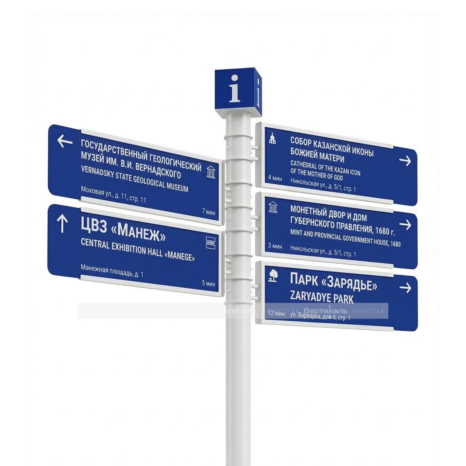 Городской указатель служит для навигации жителей и гостей, помогая быстро находить нужные объекты. Конструкция предусматривает поворотный механизм табличек, позволяющий легко обновлять информацию о направлениях без физического перемещения самого столба.