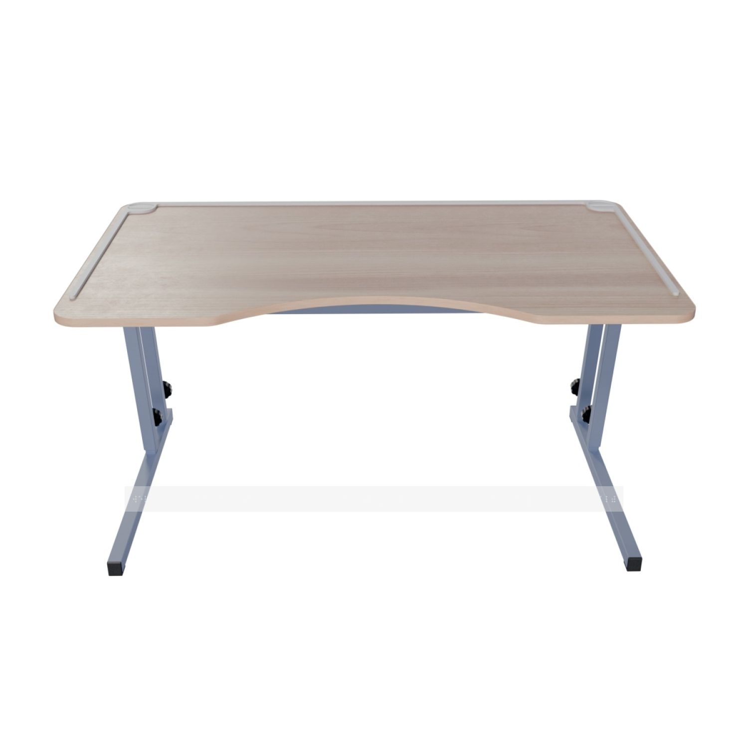 Стол выполнен на стальном каркасе с столешницей из ЛДСП и телескопическим механизмом, позволяющим фиксировать высоту до 1200 мм. Такая регулировка делает парту универсальной: за ней могут работать ученики в инвалидных креслах, на стульях или даже стоя. Радиальный вырез на лицевой стороне учитывает нужды пользователей в колясках.