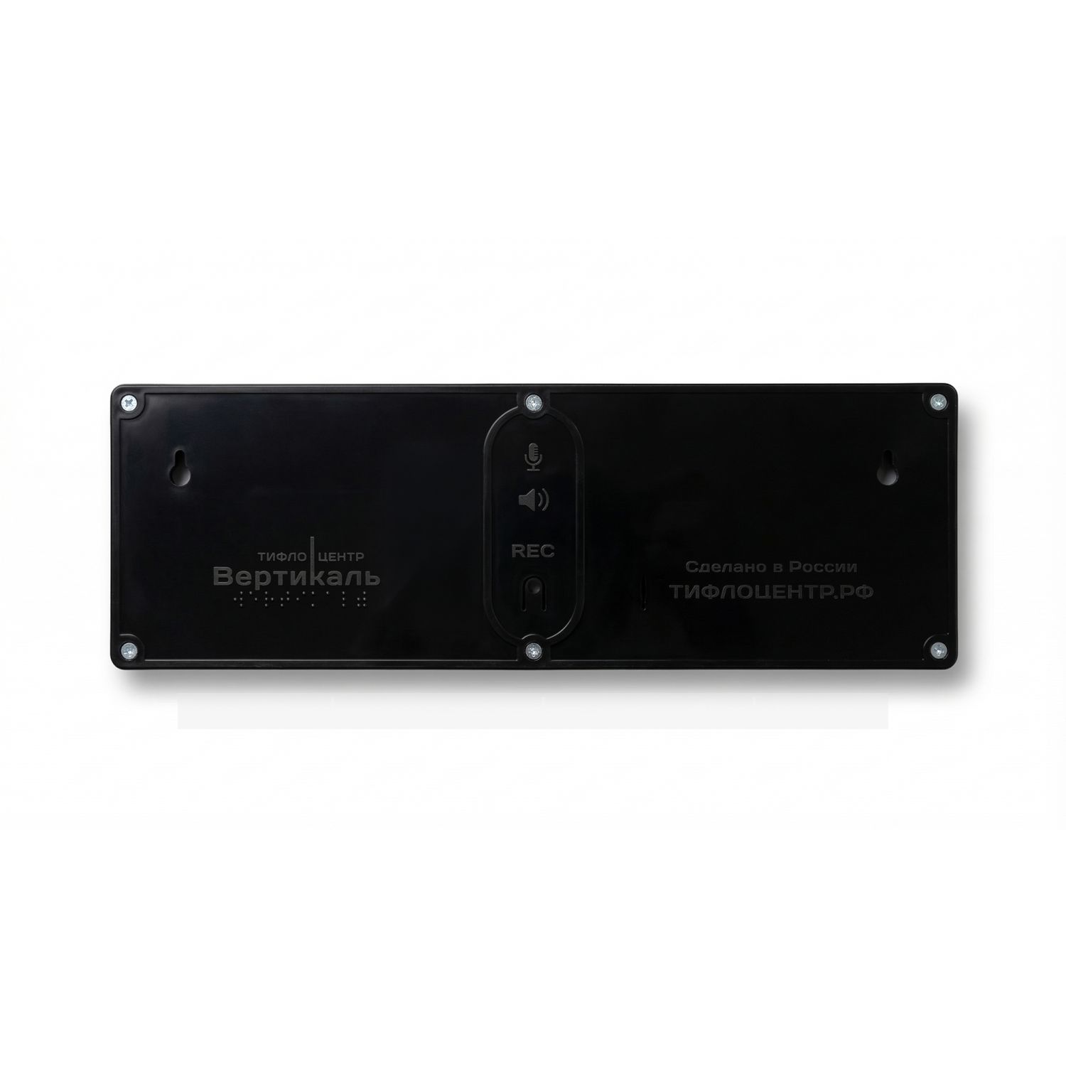 Табличка оснащена кнопкой, при помощи которой воспроизводится любое сообщение для посетителей. Длительность записи составляет до 90 секунд. Кнопка активации голосового сообщения так же выполнена методом литья, шрифт Брайля имеет единую структуру с основанием, что также гарантирует долговечность использования устройства.