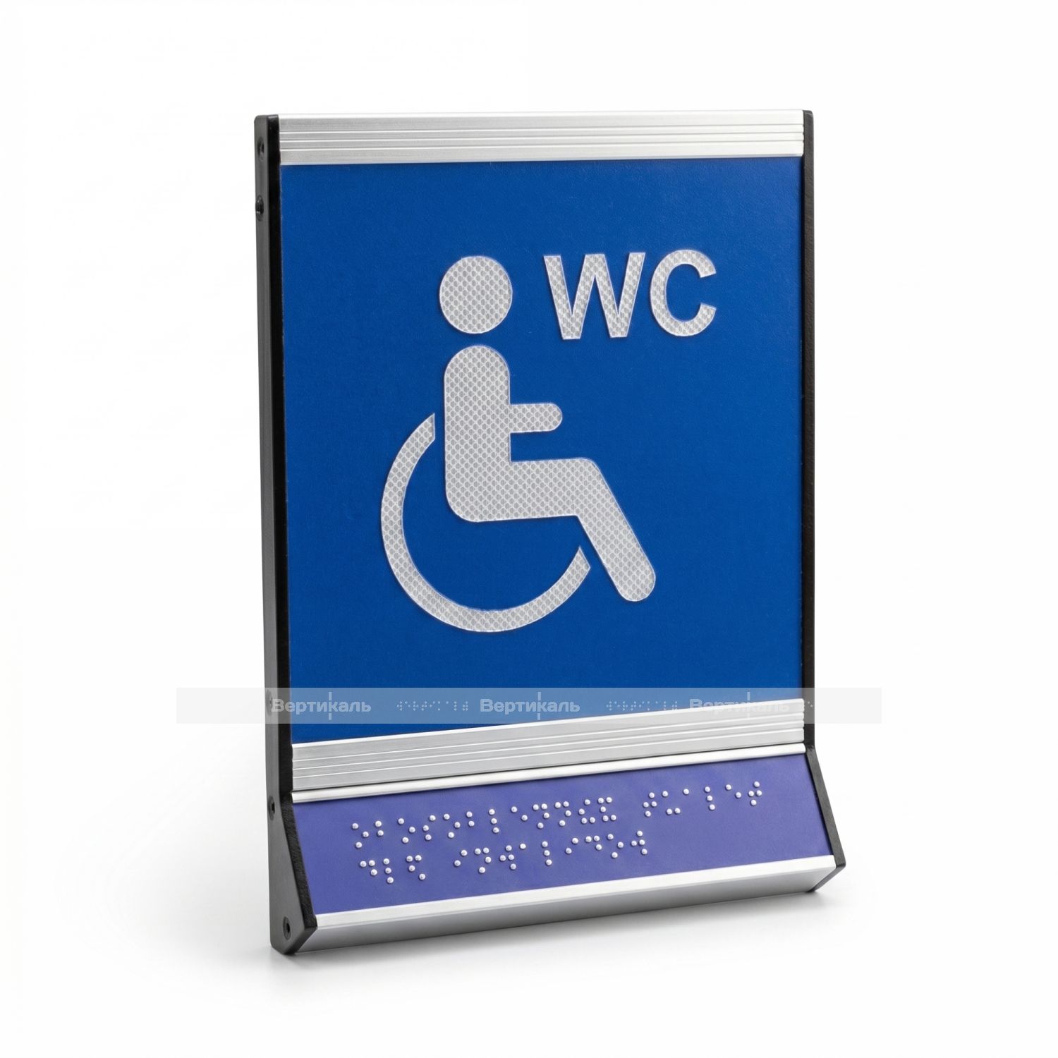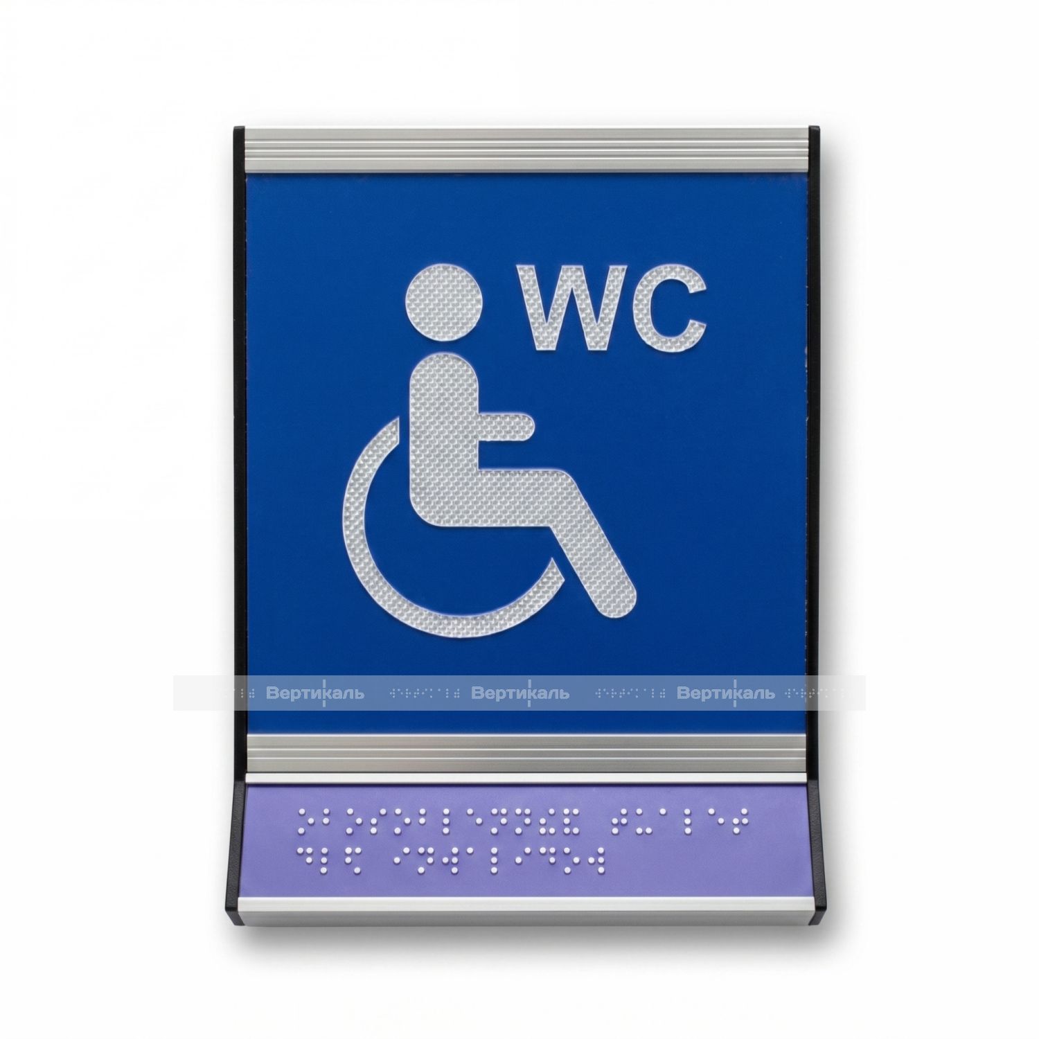Пиктограмма тактильная, модульная "Обособленный туалет доступный для инвалидов на кресле-коляске", с наклонным синем полем, белым шрифтом, одинарная, М18