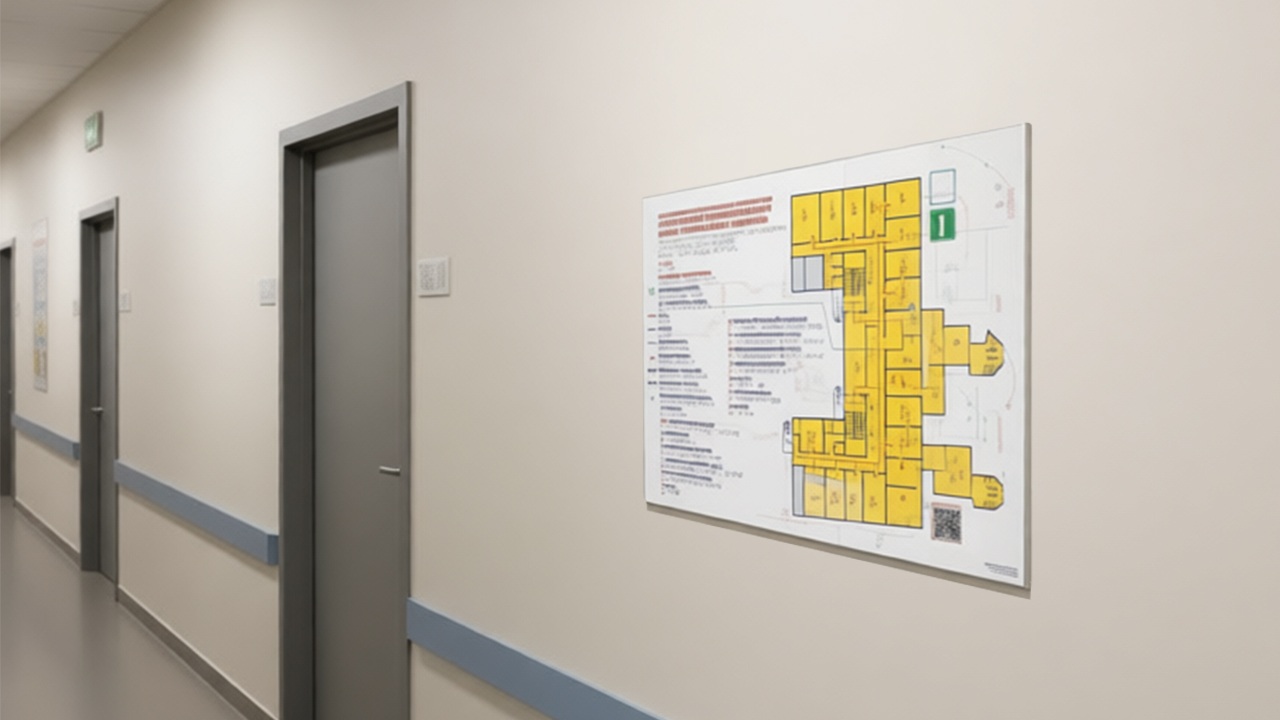 Мнемосхема предназначена для пространственного ориентирования и также выполнена на композитной основе толщиной 4 мм. Она передает тактильный план помещений или территорий, адаптированный для восприятия незрячими и слабовидящими людьми. Информация представлена в виде тактильно-графических элементов и дублируется системой Брайля.
