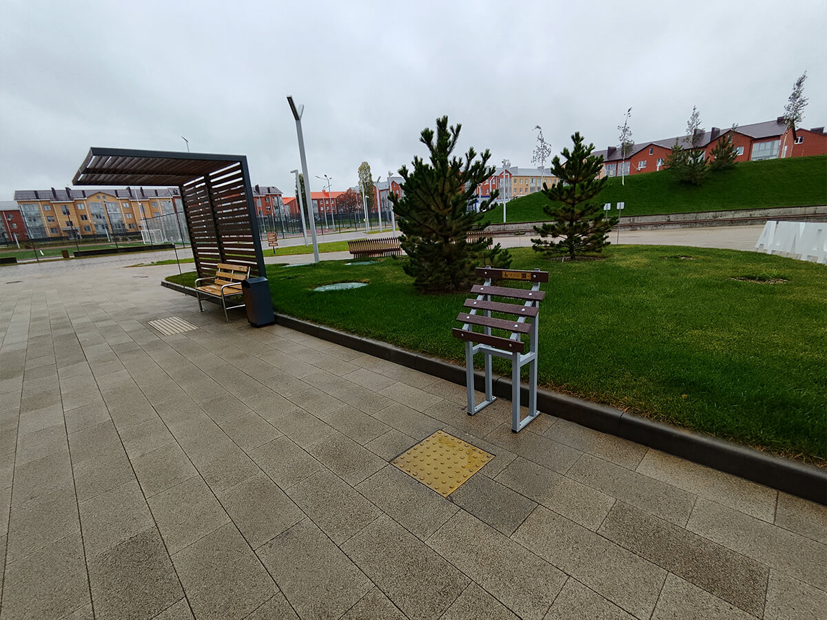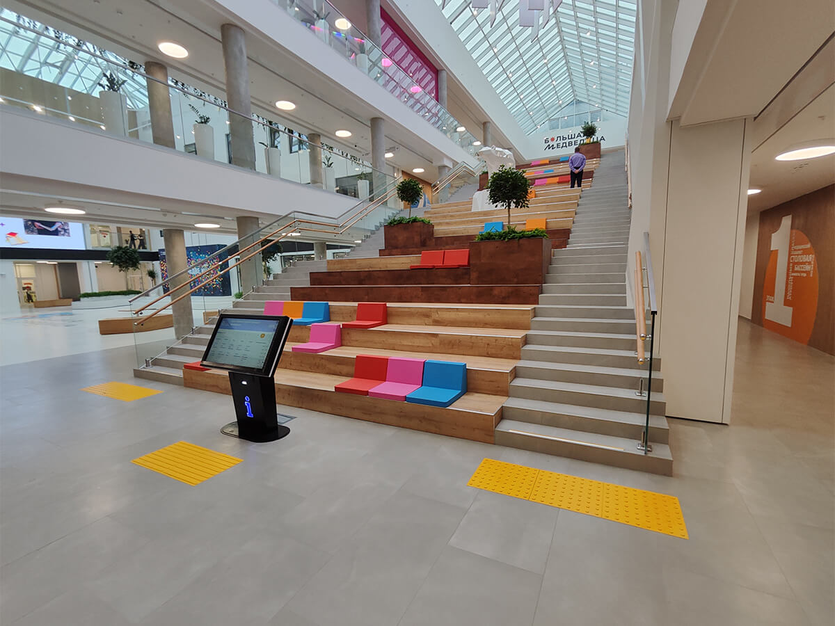 - Тактильные указатели и напольные направляющие, которые помогают слабовидящим детям самостоятельно строить маршруты.