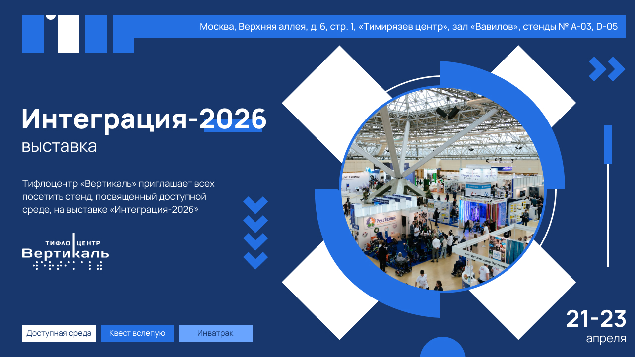 Выставка «Интеграция-2026» станет важной платформой для диалога с профессионалами отрасли: представителями реабилитационных центров, госструктур, девелоперами и общественными организациями. Тифлоцентр «Вертикаль» приглашает всех заинтересованных в создании безбарьерной и эстетичной среды посетить свой стенд, чтобы обсудить актуальные задачи и найти индивидуальные решения для их проектов.