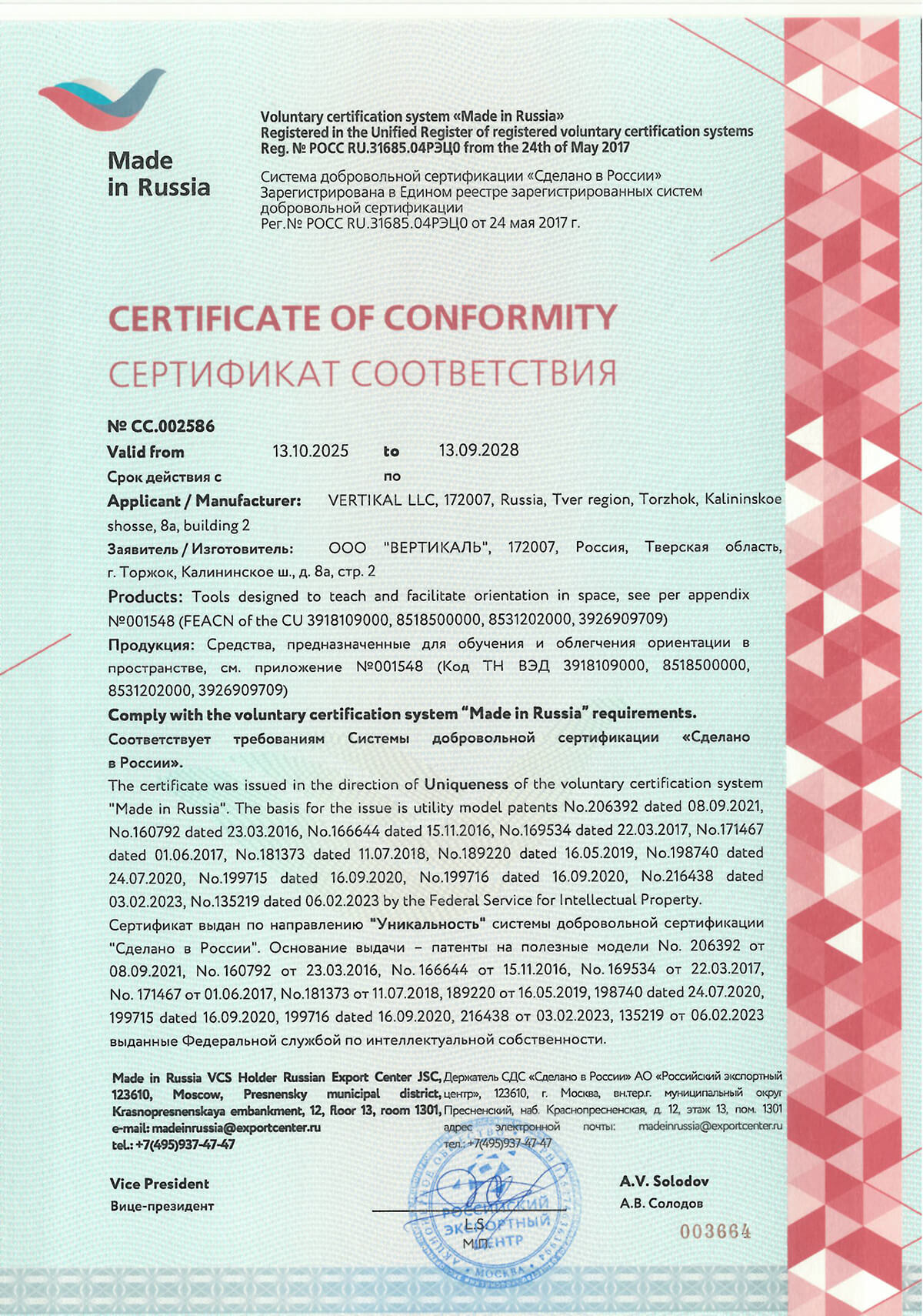 На сегодняшний день Тифлоцентр «Вертикаль» владеет более, чем 20 патентами на изобретения. Ассортимент выпускаемой продукции включает в себя самые разнообразные типы изделий: мнемосхемы, пиктограммы, звуковые маяки, мониторы и другое оборудование.