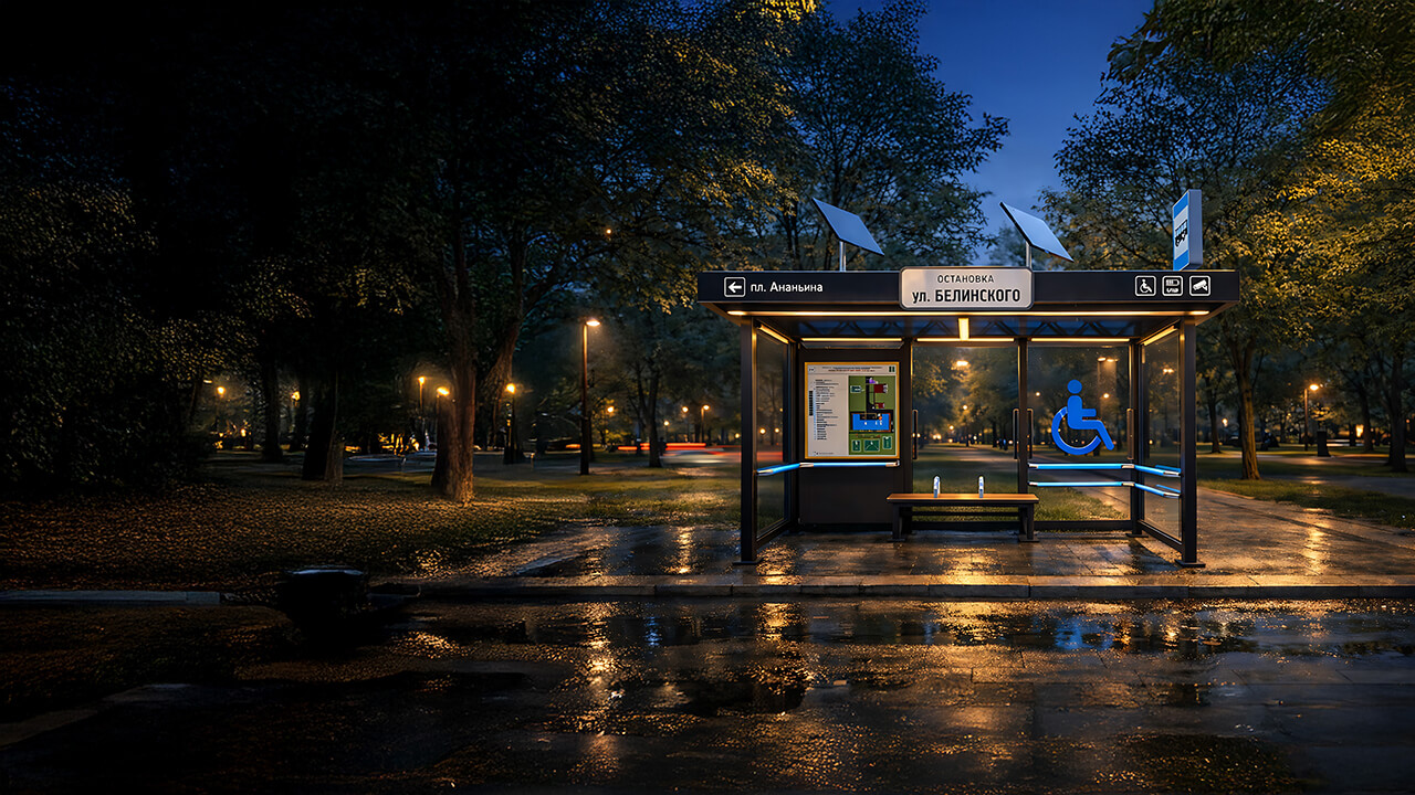- Визуальные ориентиры: подсветка дорожного знака «Место остановки» и названия самой остановки помогают идентифицировать объект издалека в любое время суток, что особенно важно для людей с ослабленным зрением.