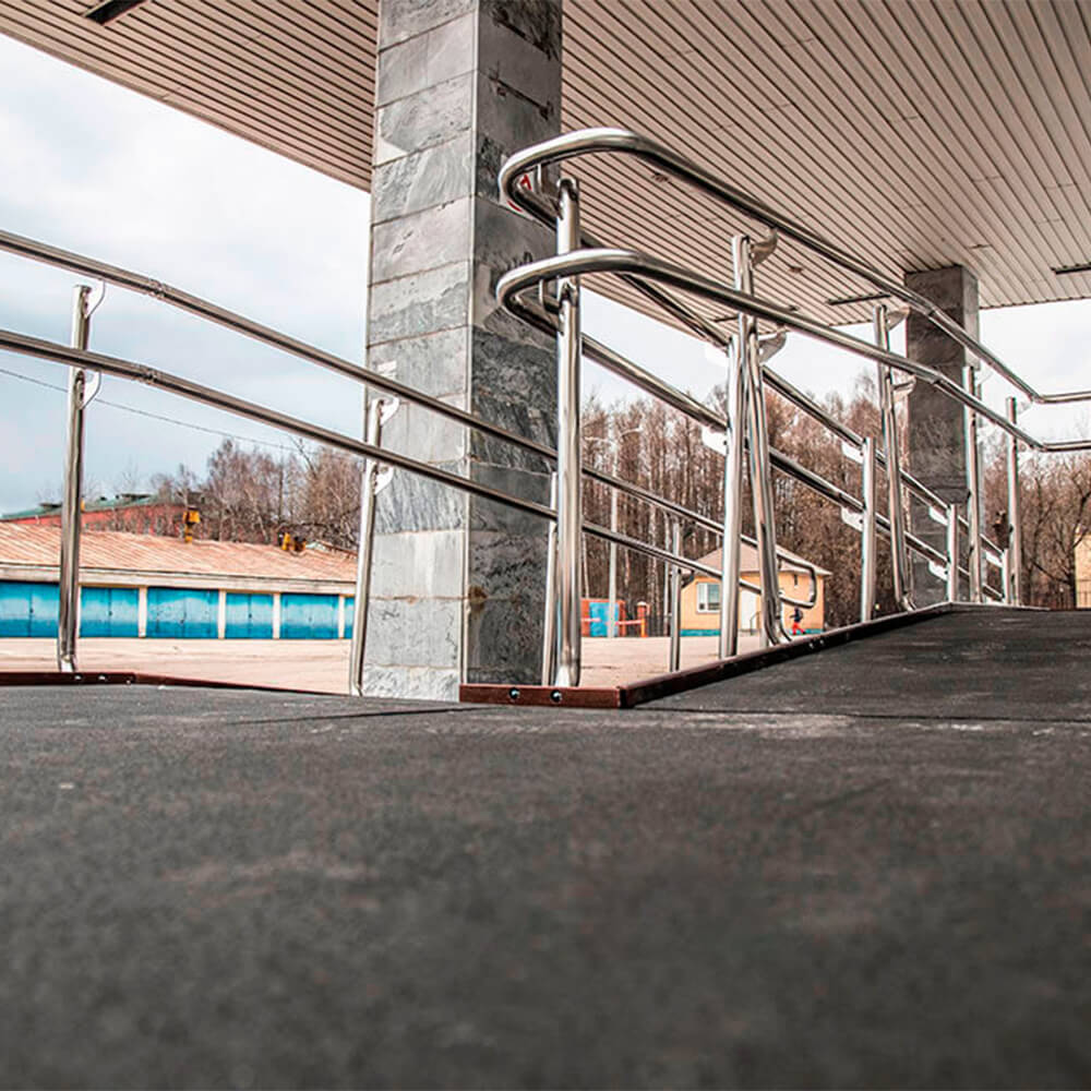 Во-первых, это параметры безопасности. В соответствии с требованиями к стационарным опорным устройствам мы используем поручни из нержавеющей стали AISI 304. Они устойчивы к коррозии, что критично для уличной эксплуатации, и имеют строго регламентированную высоту: верхний поручень на уровне 900 мм от поверхности движения, нижний – 700 мм. Это требование пунктов 5.2.5 и 5.2.6 ГОСТ Р 51261-2022, обеспечивающее удобство как для инвалидов на креслах-колясках, так и для людей с нарушениями опорно-двигательного аппарата, передвигающихся с тростью.
