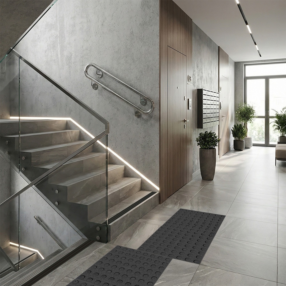 Пункт 4.9 СП 54.13330.2022 обязывает обеспечить доступность путей движения от входа до лифтового холла и лестничной клетки. Для ориентации людей с нарушениями зрения необходимы тактильные средства информации.