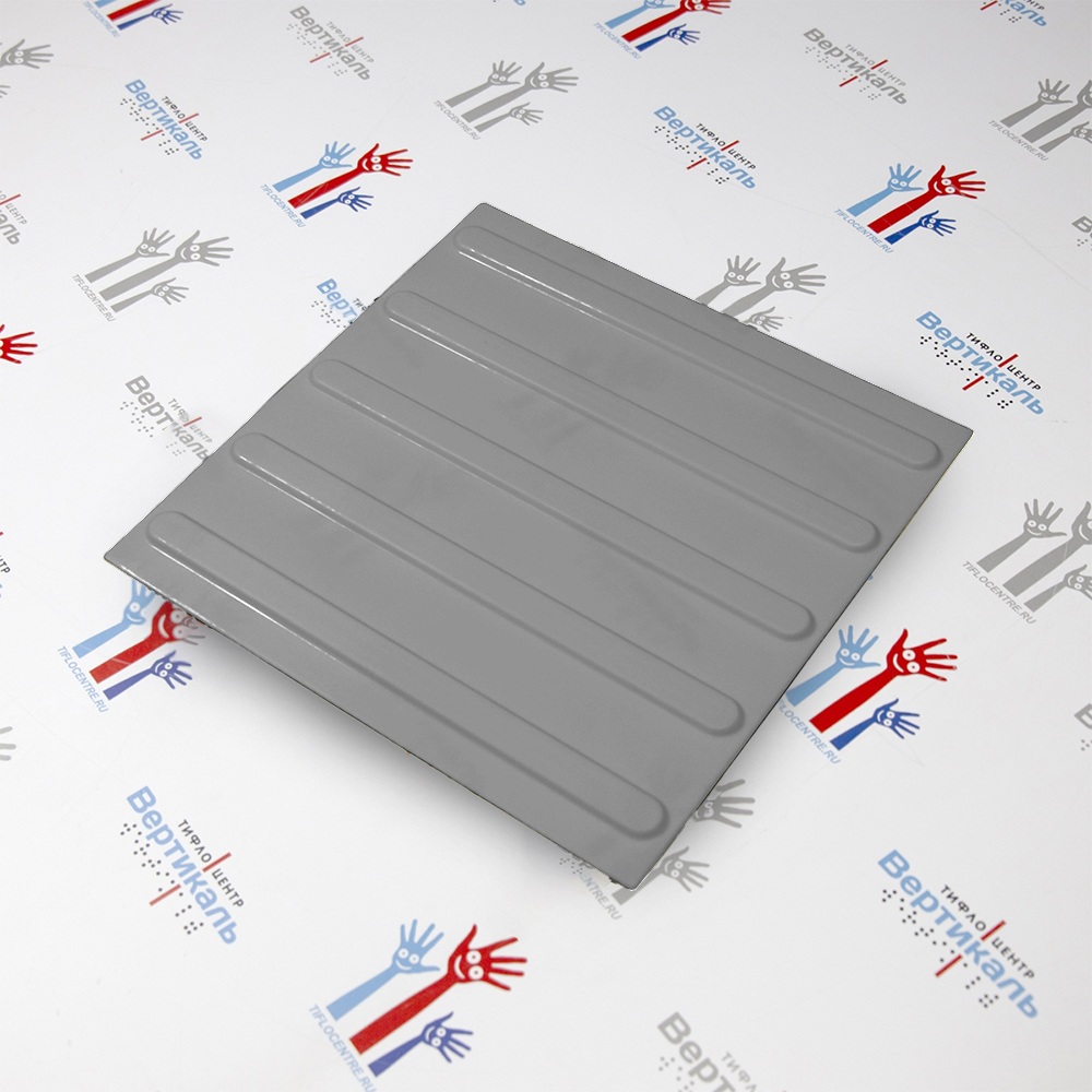 Тактильная плитка из нержавеющей стали Изготавливается из стали AISI 304 толщиной 1–2 мм. Имеет группу горючести НГ (негорючие материалы), поэтому применяется в местах с повышенными требованиями пожарной безопасности. Для амортизации используется пластиковый демпфер.